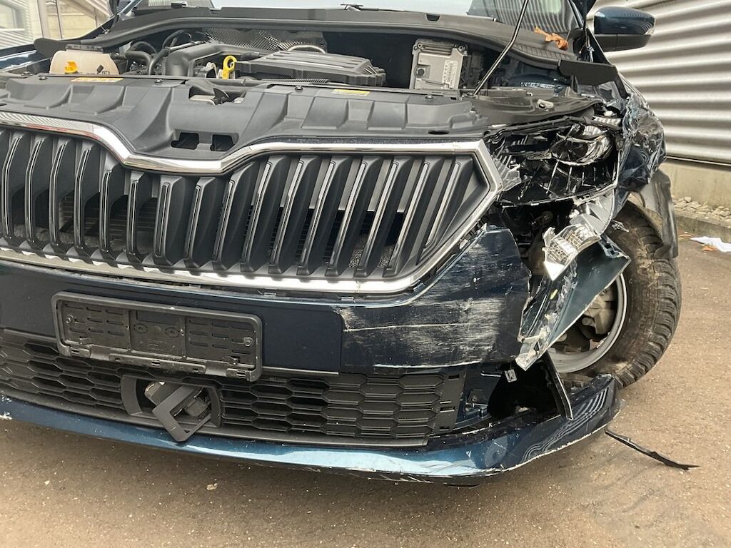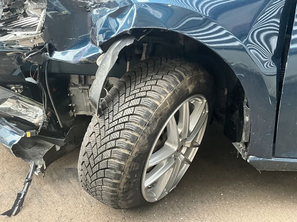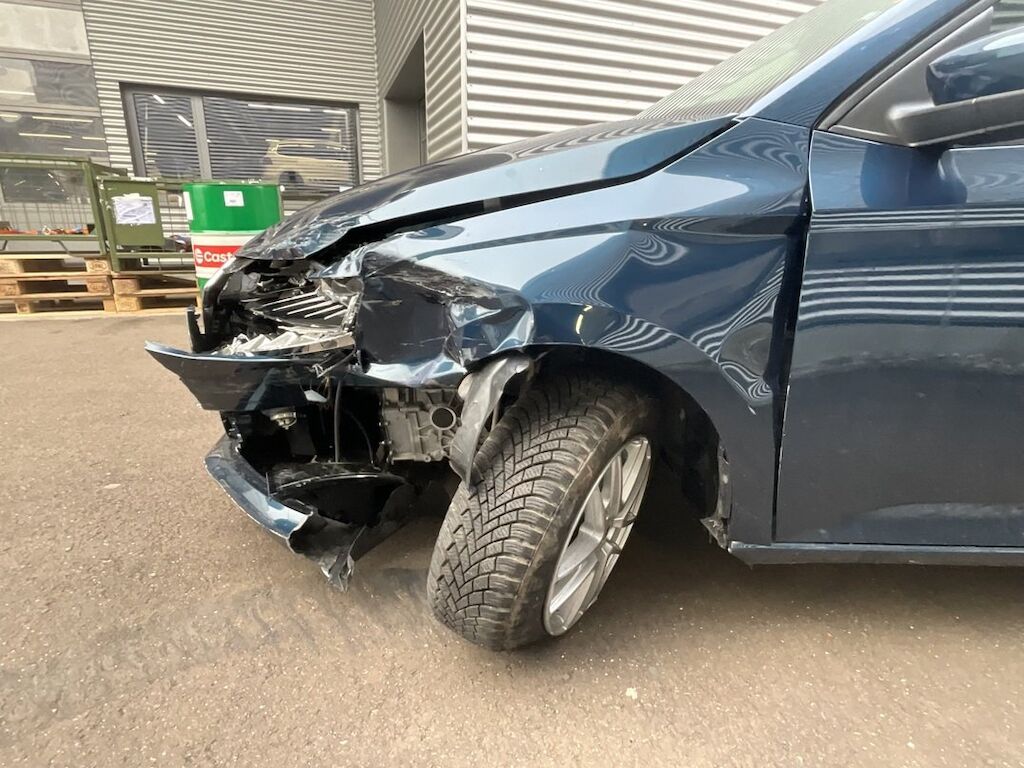Pare-chocs avant, capot moteur, calandre, phare gauche, aile avant gauche, direction, train roulant gauche, jante avant gauche endommagés.