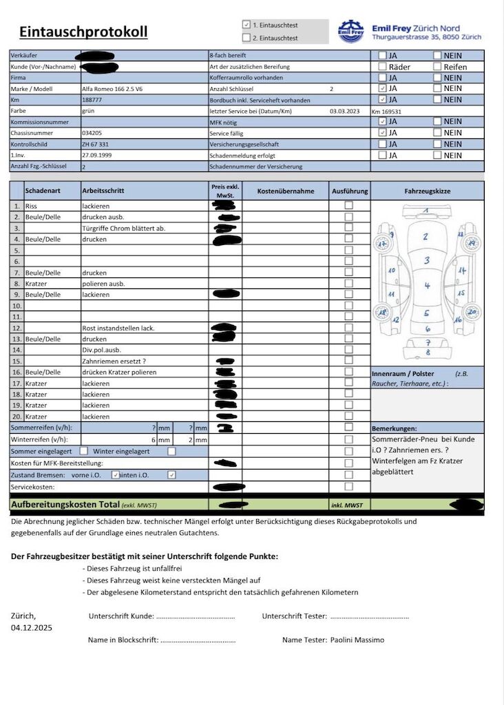 | Keine Gewähr auf die Angaben der Sonder- und Serienausstattung / keine mechanische Prüfung. Fahrzeug wurde unzerlegt expertisiert / keine Haftung für allfällige, nach Demontage bekanntwerdenden Mängel. Fahrzeugbereifung und Ausstattung gemäss Fotos / Fahrzeugkauf auf eigenes Risiko ab Platz ohne Nachwährschaft. Keine technische Prüfung (Werkstatttest) vorgenommen Diverse Schäden an Karosserie/Lack. 8-fach bereift. Fahrzeug ab Platz, ohne Garantie und Aufbereitung. Fahrzeug ist für Export – Diverse Dellen und Kratzer am gesamten Fahrzeug – Chrom blättert ab bei all 4 Türgriffe – all vier Felgen verkratzt – Letzter Service am 03.03.2023 bei 169531 km |