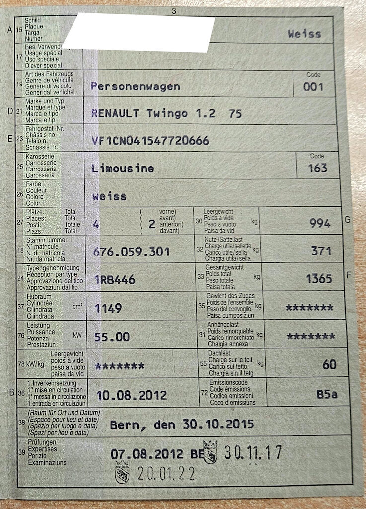 Kotflügel VR, Türe VR, Seitenwand HR, Raddackel VR + HR, Stossstange HR, Seitenairbag VR + Gurtstraffer VR.