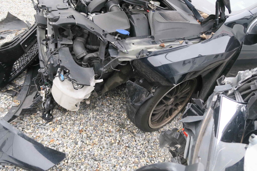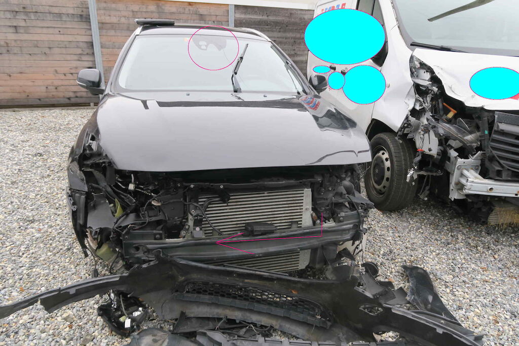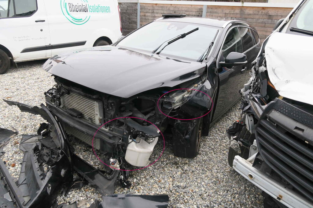 Scheinwerfer, Front, Motorenträger, Stosstange, Motor Haube, Kotflügel VL+ VR, Servolenkung, Ausgleichsbehälter, Waschwassertank, Schweller, Radaufhängung vorne links, LEnkung Risiko, Radhaus – A-Säule beschädigt, reifen sollten ersetzt werden