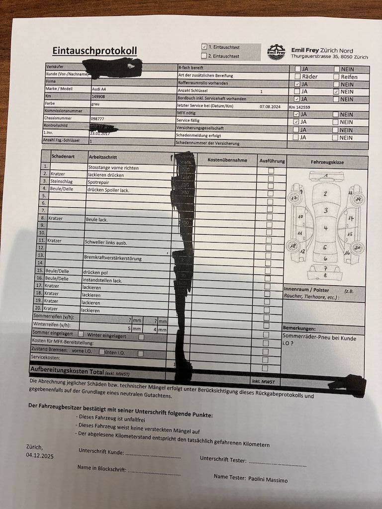 | Keine technische Prüfung (Werkstatttest) vorgenommen Diverse Schäden an Karosserie/Lack. . Fahrzeug ab Platz, ohne Garantie und Aufbereitung. Fahrzeug ist für Export – Div. Kratzer und Dellen am gesamten Fahrzeug. – Letzter Service am08.07.2024/142599KM -Bremskraftverstärker Fehlermeldung -MFK Fällig &Service -Aufbereitung nötig |