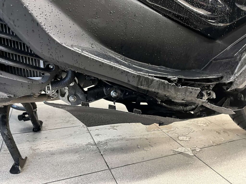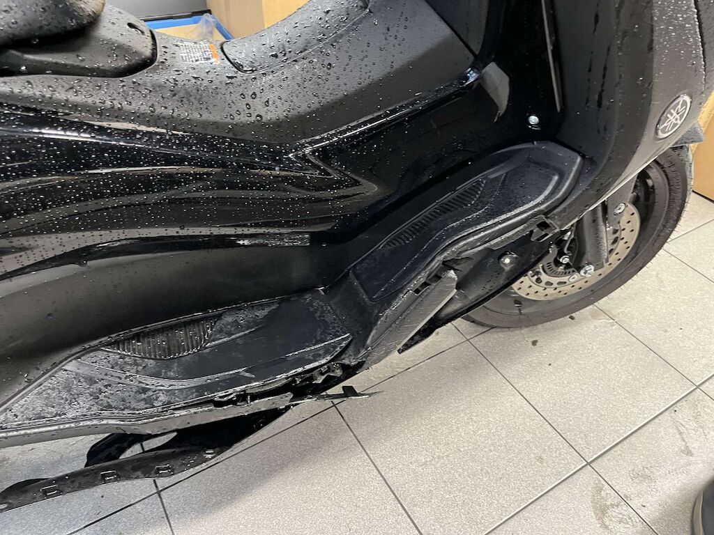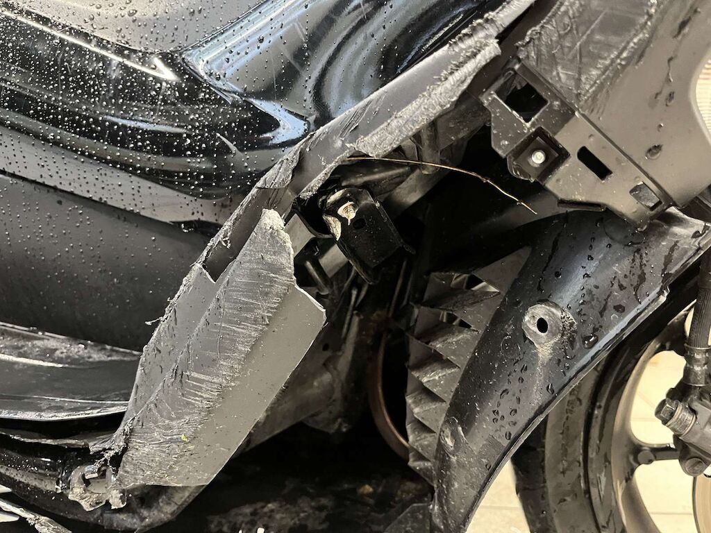 Rétroviseur, levier de frein, embout de guidon, carénage avant droit, tablier intérieur, bas de caisse droit, repose pied, cadre, carénage arrière droit, échappement, poignée passager, support moteur endommagés et cassés.