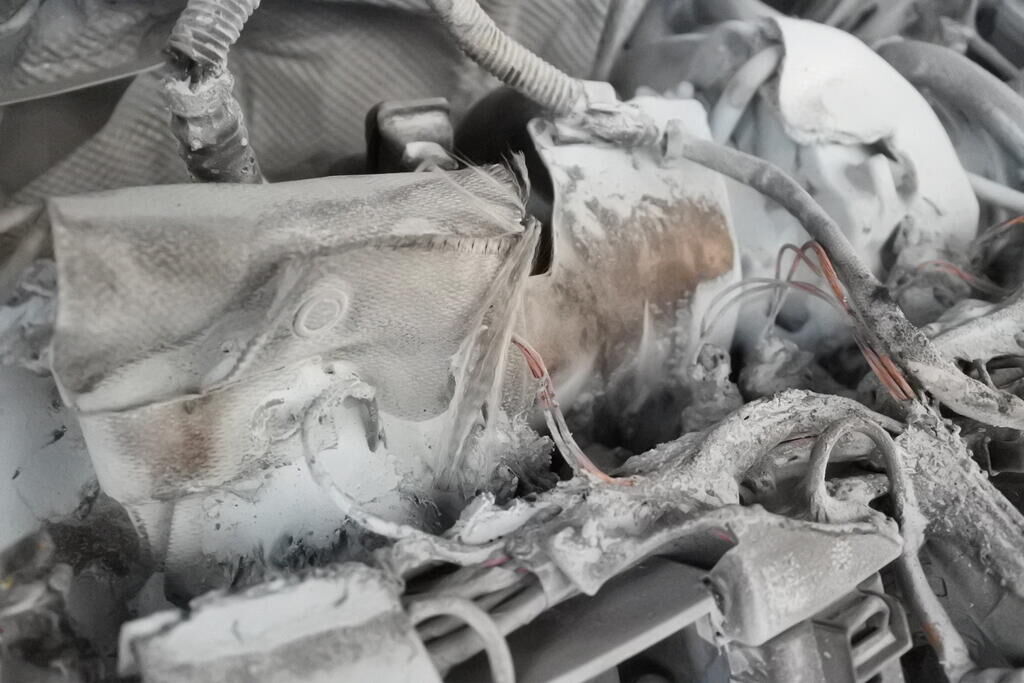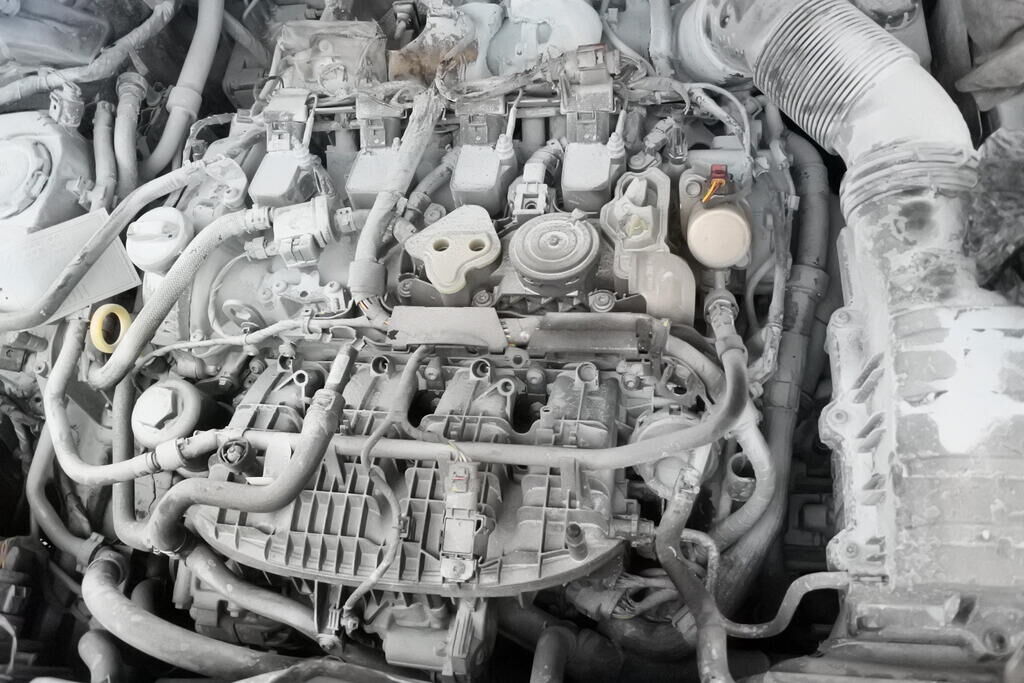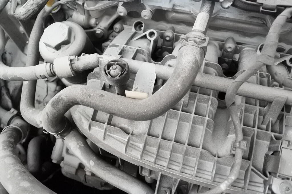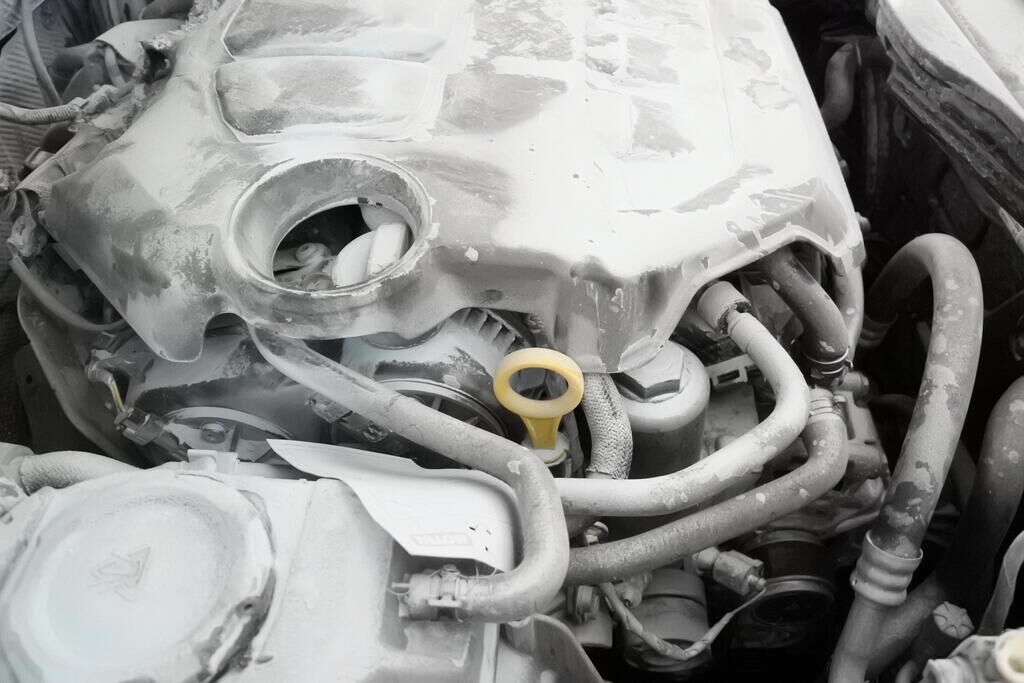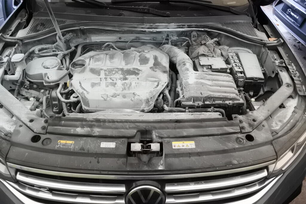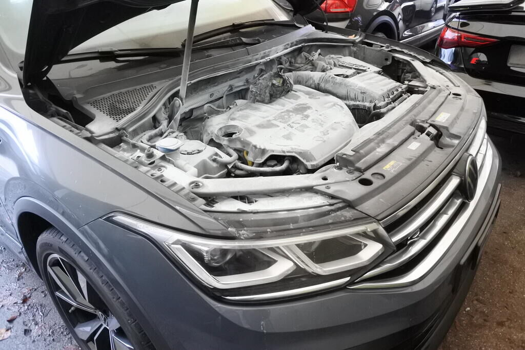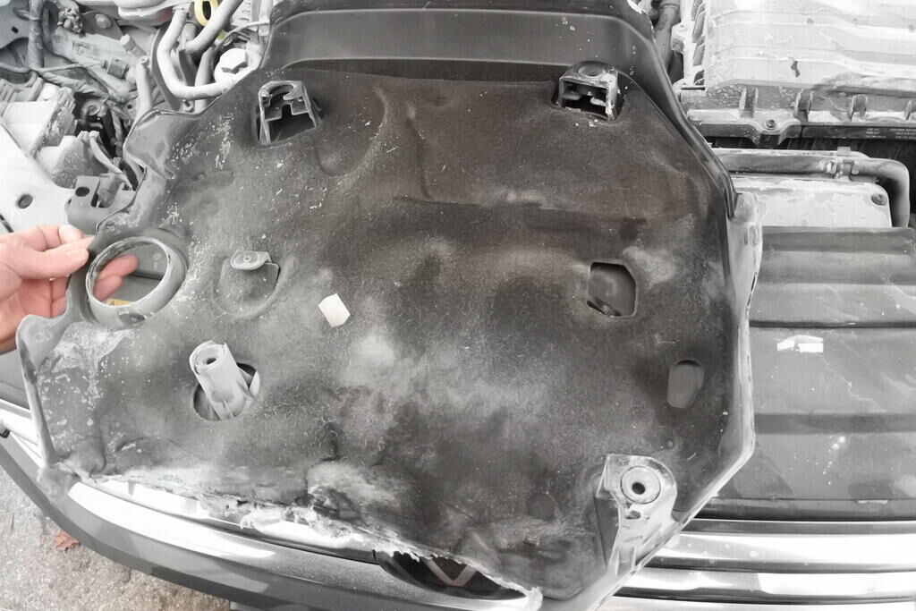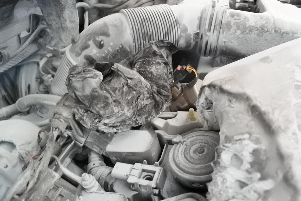 Die Motorabdeckung oben wurde in Folge der fehlerhaften Montage überhitzt. Sie entzündete sich durch die Hitzeabstrahlung vom Turbolader welcher unmittelbar hinter der Abdeckung positioniert ist. Verschiedene Verkabelungen, Abdeckungen, Isolationen wurden in Folge vom offenen Feuer beschädigt. Neben den Motoranbauteilen wurden auch diverse elektrische und elektronische Bauteile örtlich beschädigt. Risiko Kabelstrang, Steuergerät, Folgeschäden usw. ) Das Feuer wurde mittels einem Staubfeuerläscher erstickt. Diese Rückstände wurden ca. 24 Std. später sehr nachhaltig entfernt.