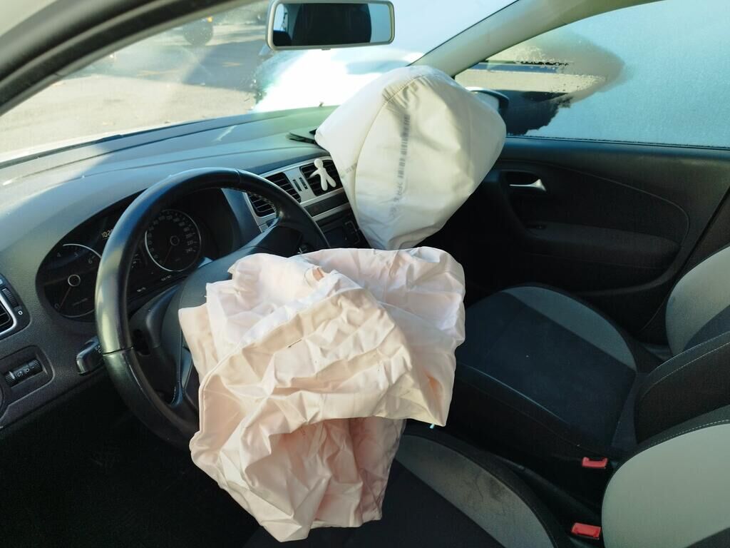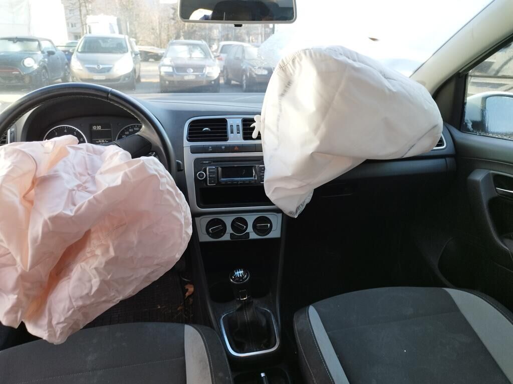Die Stossstange vorne ist gerissen, der Scheinwerfer vorne rechts hat Kratzspuren, der Kühlergrill ist gerissen, der Scheinwerfer vorne links ist ausgerissen, der Kotflügel vorne links ist nach aussen gestaucht, die ganze Front ist nach links verschoben, der Fahrerairbag ist ausgelöst, der Beifahrerairbag ist ausgelöst, alle Gurtstraffer sind ausgelöst.