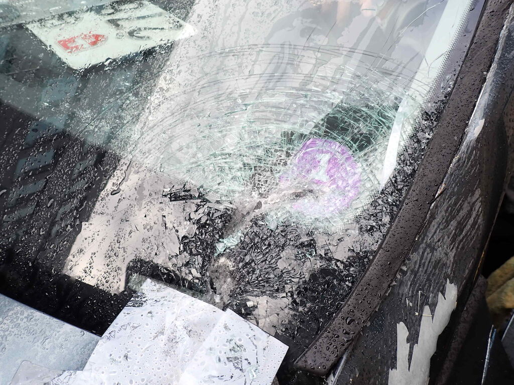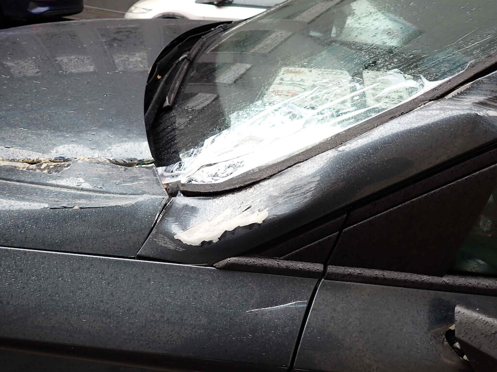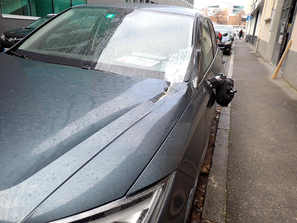 Pare choc avant, aile av.g, capot, pare brise, montant gauche du pare brise, porte av.g et retroviseur gauche, glace de porte gauche, porte ar.g endommagés