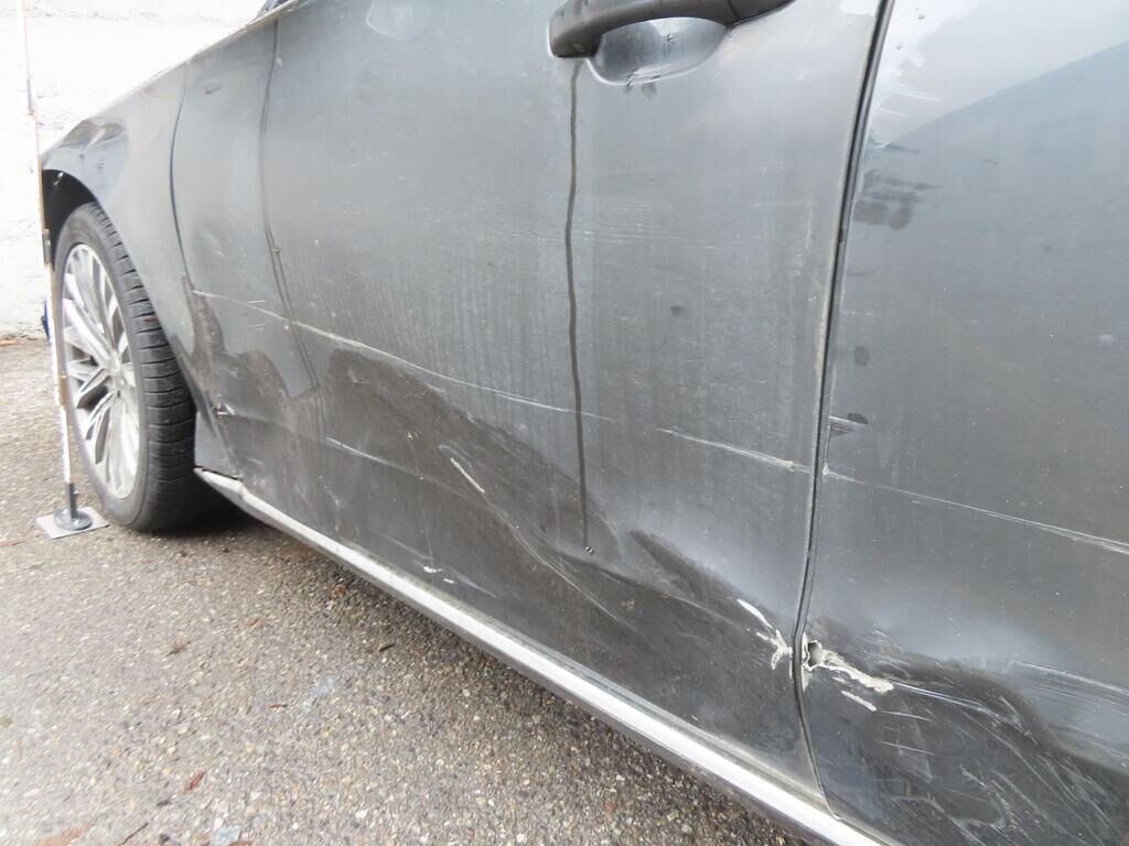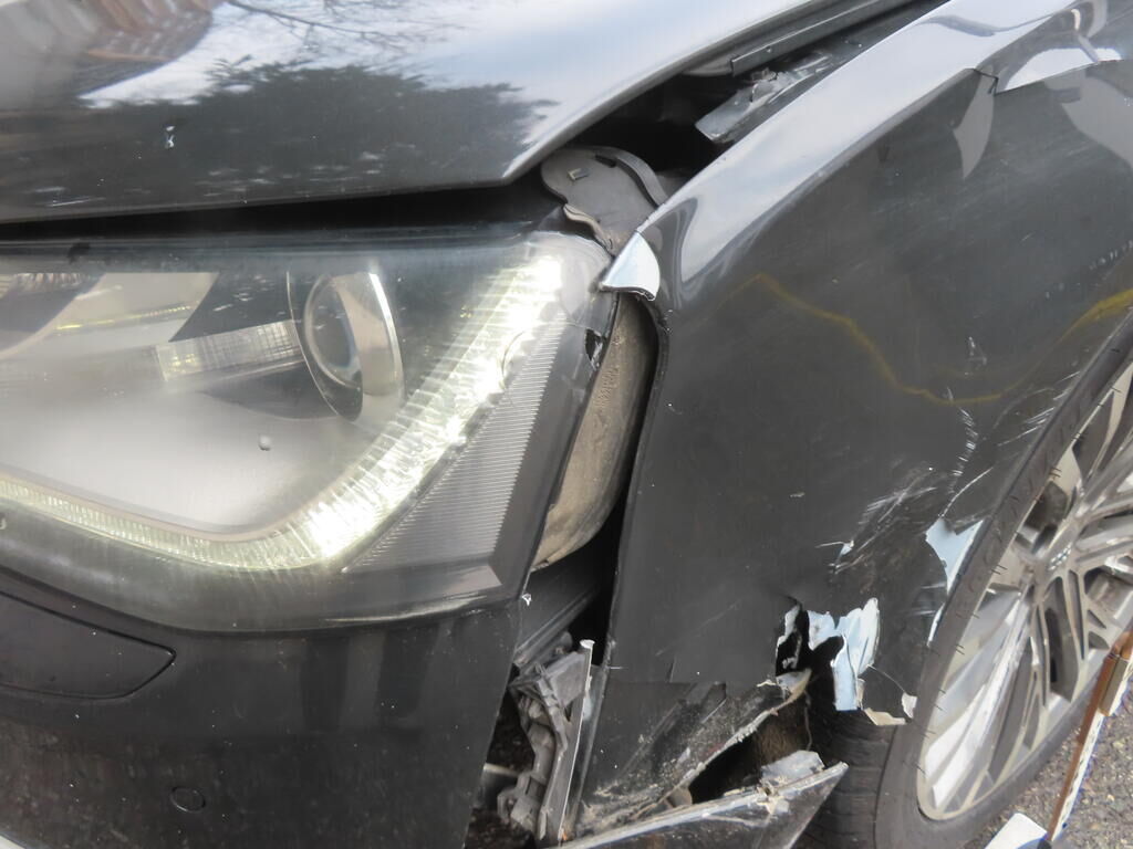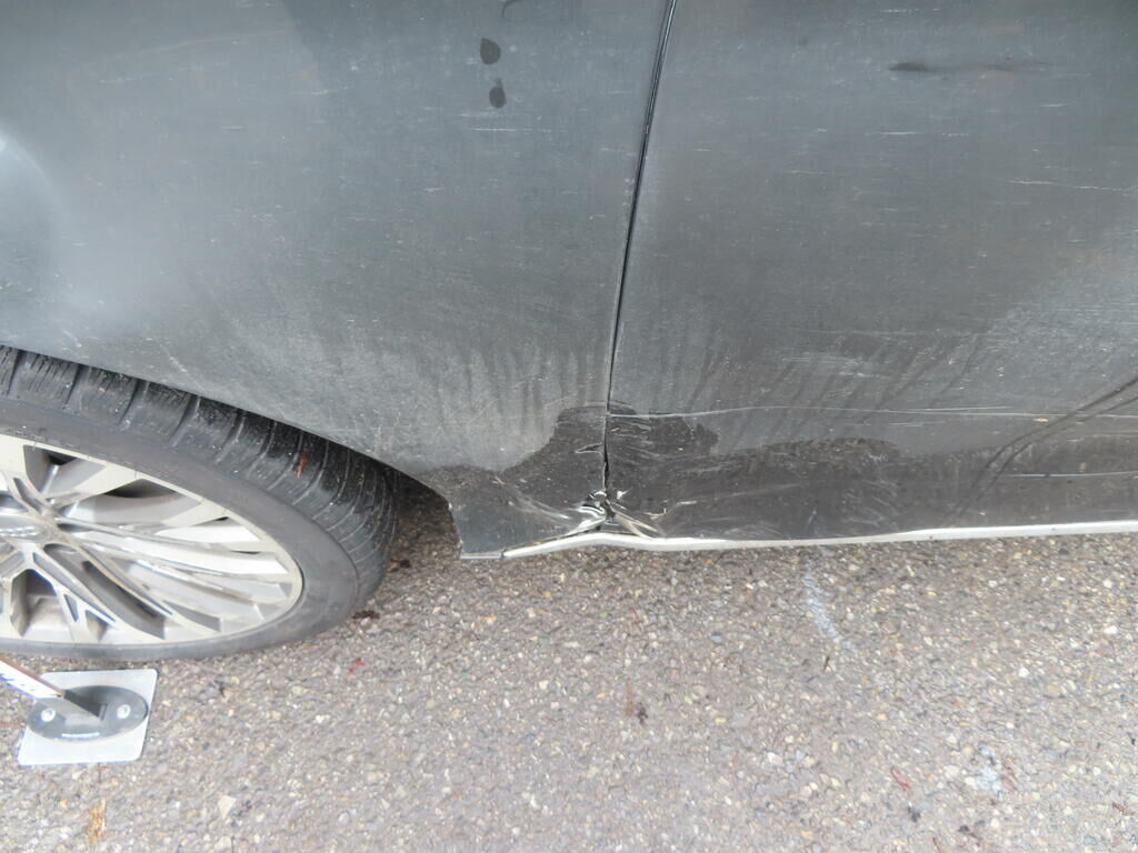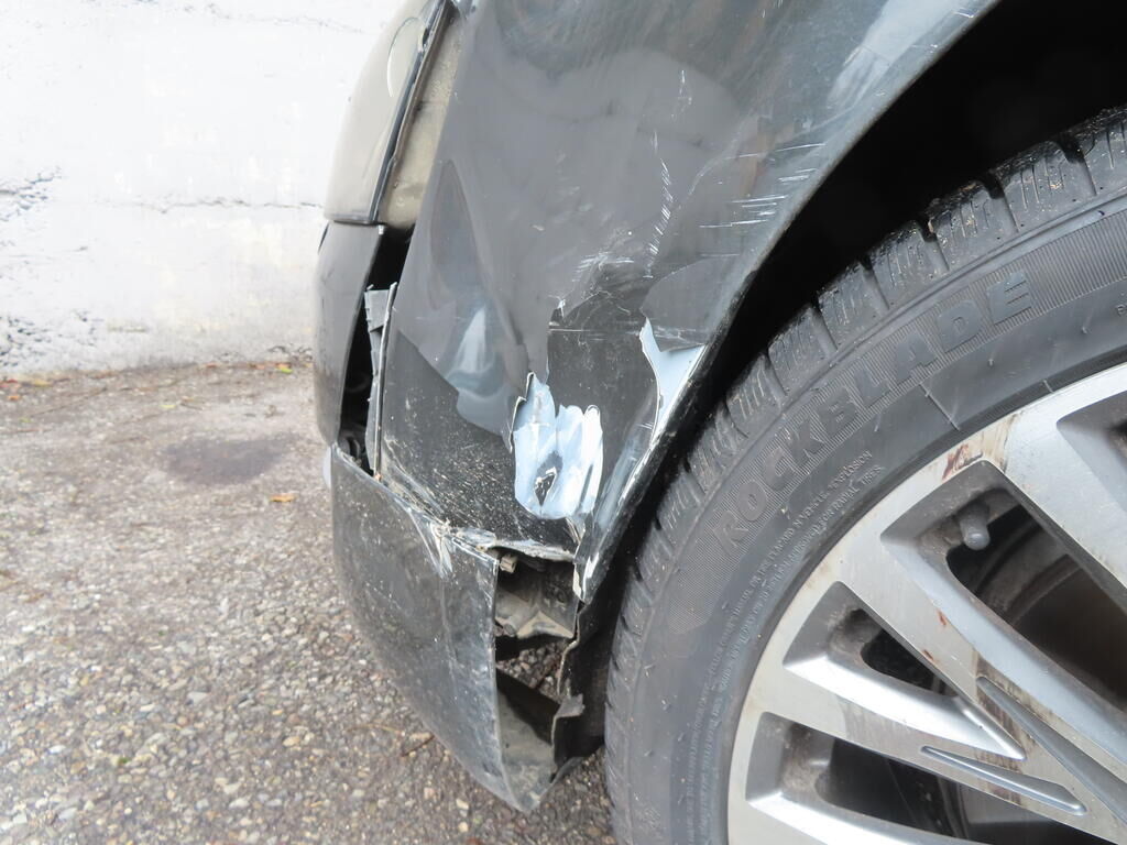 Pare-chocs avant, phare avant, aile avant, portes avant et arrière, aile arrière, montant, jantes avant et arrière; enfoncés et pliés.