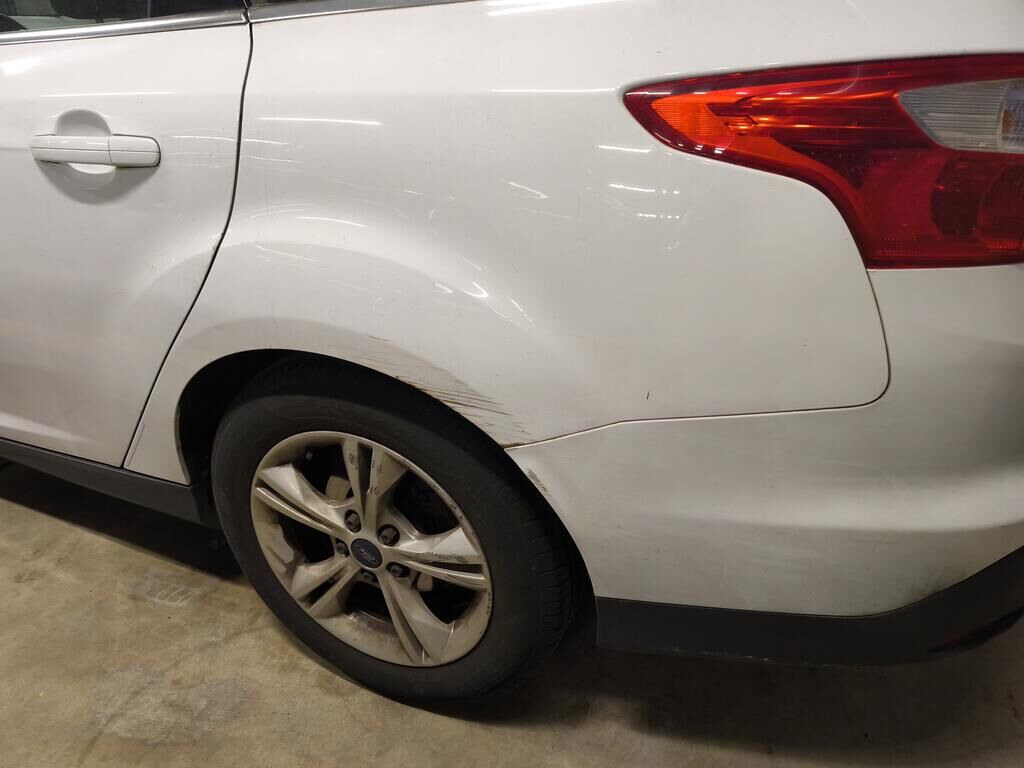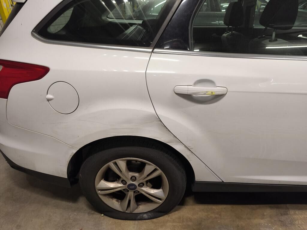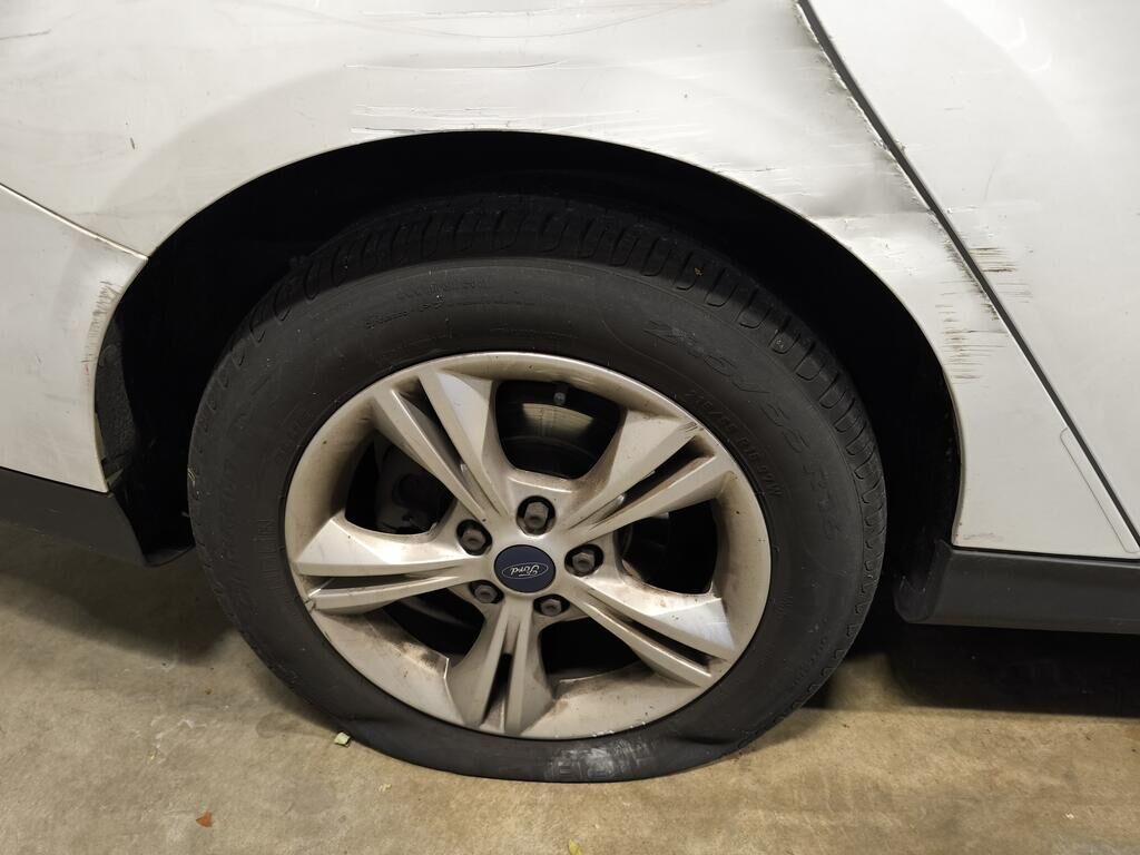 Die Seitenwand rechts und das Rad hinten rechts sind ebenfalls beschädigt. Das Fahrwerk hinten rechts ist beschädigt.