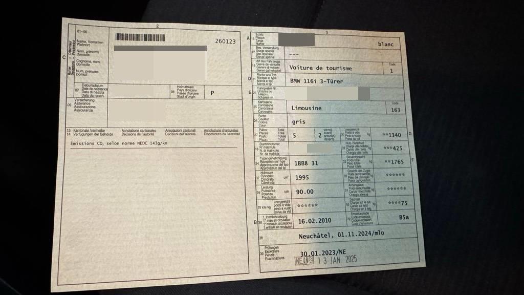 Kofferraumfernentriegelung, Zweiklanghorn, Skisack, ISOFIX Kindersitzvorrichtung, Antiblockiersystem (ABS), Digital Uhr, Katalysator geregelt, Tageskilometerzähler, Licht: Nebelschlussleuchte, Airbag: Airbag Fahrer und Beifahrer, Innenlicht-Abschaltverzögerung, Schutzleisten für Stossstangen vorne und hinten, Aux-In Anschluss, Befestigungsösen im Laderaum, Motor Start-/Stop-Anlage, Aussentemperaturanzeige, Grün getönte Scheiben, Wegfahrsperre elektronisch, Blinkleuchten seitlich vorn weiss, Radzierblenden, Scheibenwischer vorne mit Intervall, Aussenspiegel rechts und links elektrisch verstellbar, Zentralverriegelung mit Fernbedienung, Bordcomputer, Beleuchtetes Handschuhfach, Lichtwarnsummer, Heckscheibenheizung, iDrive-System, Automatische Stabilitäts- und Traktions- kontrolle, Einstiegsschienen, Kombi-Instrumente mit Chromzierringen, Rücksitzlehne geteilt abklappbar, Lenkung, elektrisch unterstützt, Vordersitze höhenverstellbar, Bremsbelag-Verschleissanzeige, Drehzahlmesser, Heckscheiben-Wisch-/Waschanlage, 3 Kopfstützen hinten, Seitenaufprall-Schutzsystem, Wartungsintervall-Anzeige, Drittes Bremslicht, Make up-Spiegel links, 12-Volt-Steckdose vorne, Lackierung: Uni-Lackierung, Oelstandsanzeige, Radiovorbereitung, Antenne, Entstörung und 6 LS, Tagfahrlicht, Gurtkontrolle, Stossstangen und Aussenspiegel in Wagenfarbe, Getriebe: 6-Gang-Getriebe, Make up-Spiegel rechts, Check-Control-System, Dynamische Stabilitätskontrolle (DSC), Durchladeklappe, Leuchtweitenregulierung elektrisch, Interieurleisten in Silber, Weisse Blinkleuchten, BMW Mobility System, Gurtstraffer vorne, Lenkrad: Lenkrad längs- und höhenverstellbar, Nichtraucherausführung, Assist: Cornering Brake Control (CBC), Türgriffe in Wagenfarbe, Abschliessbare Radschrauben, Stahlräder, Halogenscheinwerfer, Stoff-Ausstattung, 3-Punkt-Sicherheitsgurte auf allen Plätzen, Radio BMW Business CD, Bremsassistent (BAS), Reifendruckverlust-Warnsystem, Seitenairbags, Elektrische Fensterheber vorne, Abblendlichtausschaltverzögerung ‘Follow me home’, Window-Kopfairbags