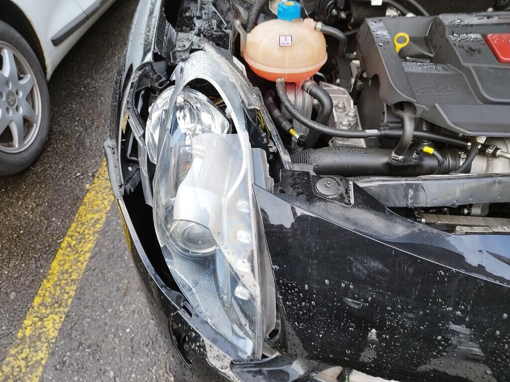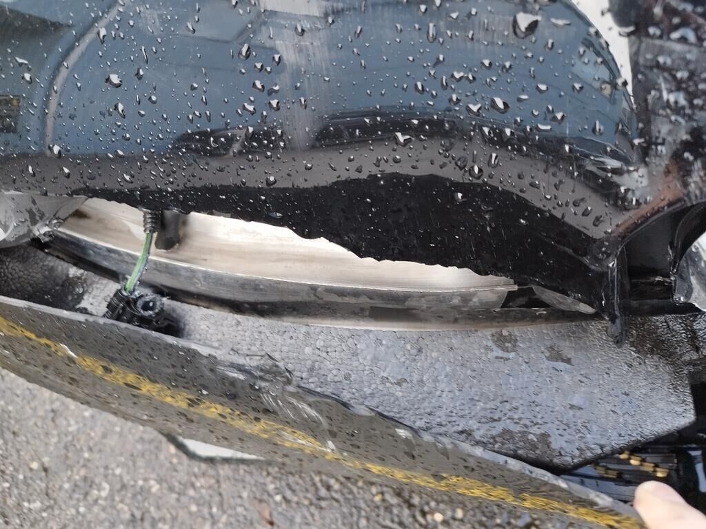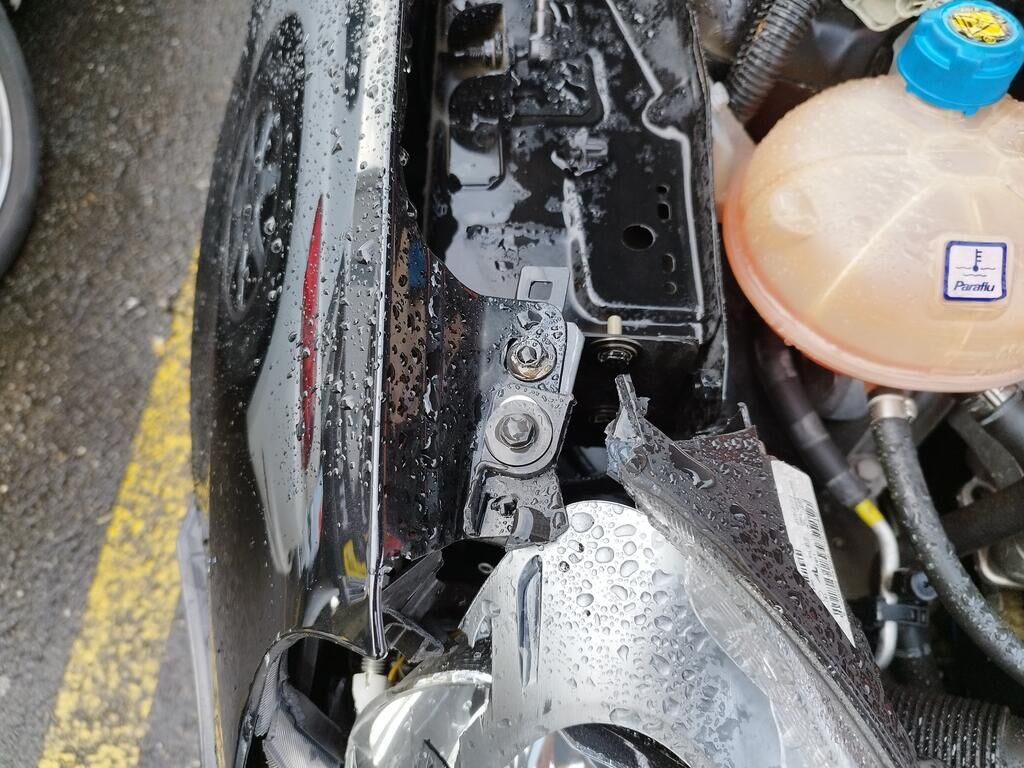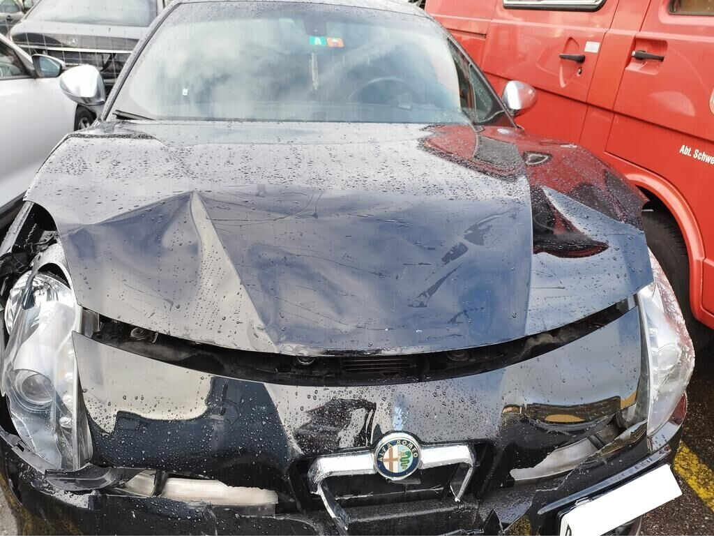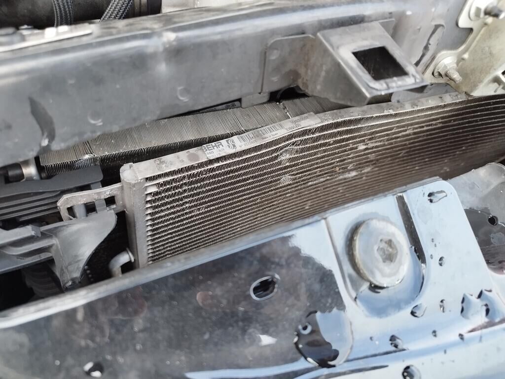 Die ganze Front ist deformiert, alle Kühler sind deformiert, der Kotflügel vorne rechts ist gestaucht.