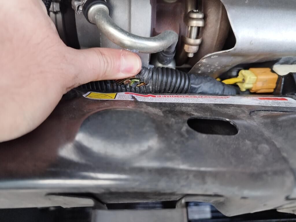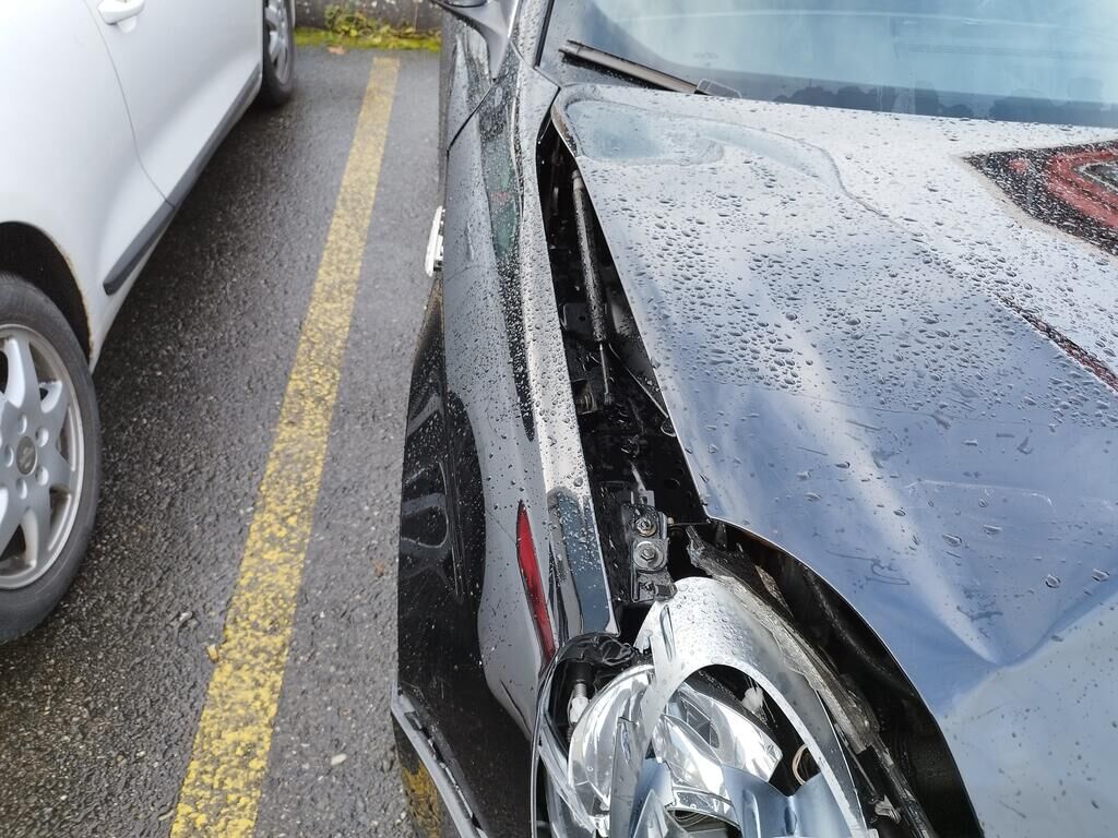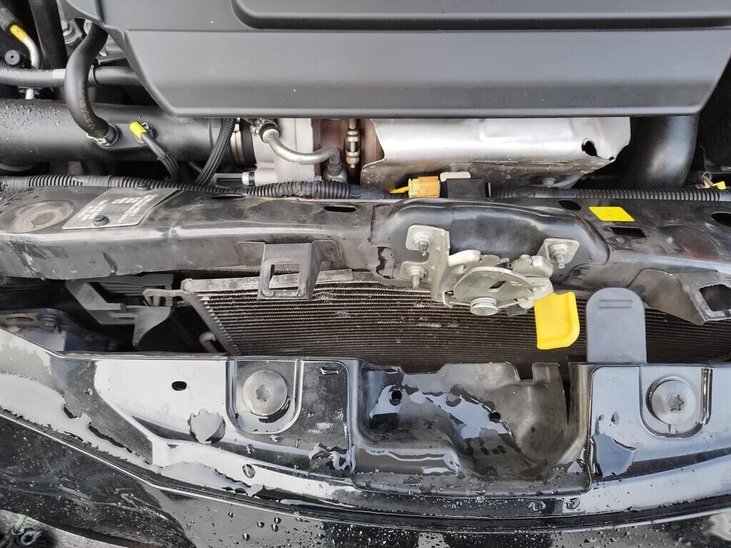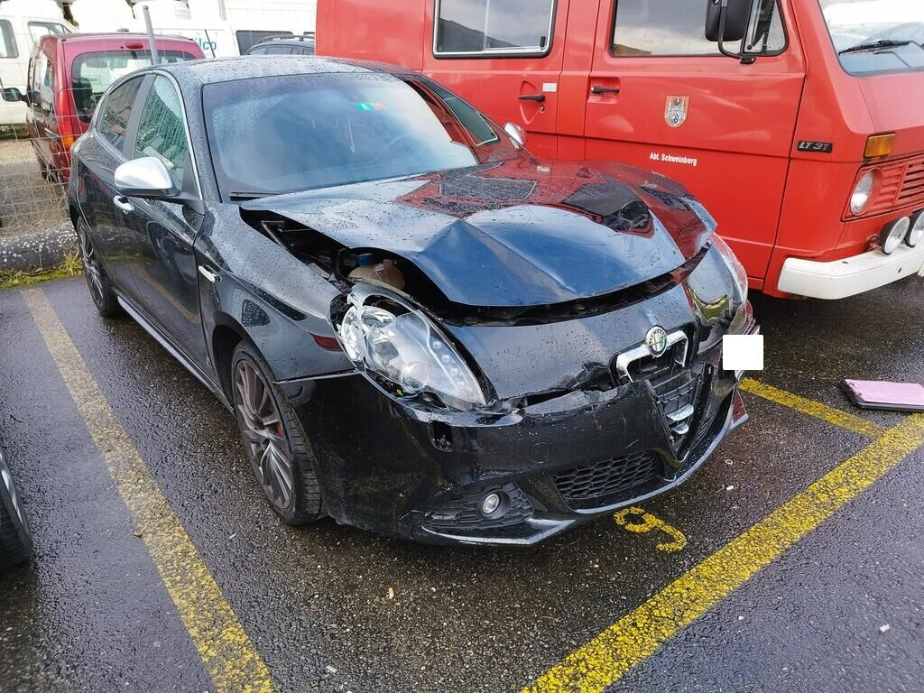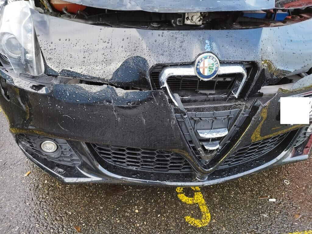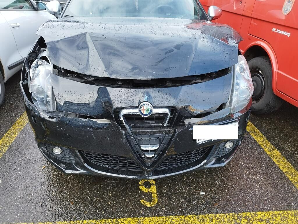 Die ganze Front ist deformiert, alle Kühler sind deformiert, der Kotflügel vorne rechts ist gestaucht.