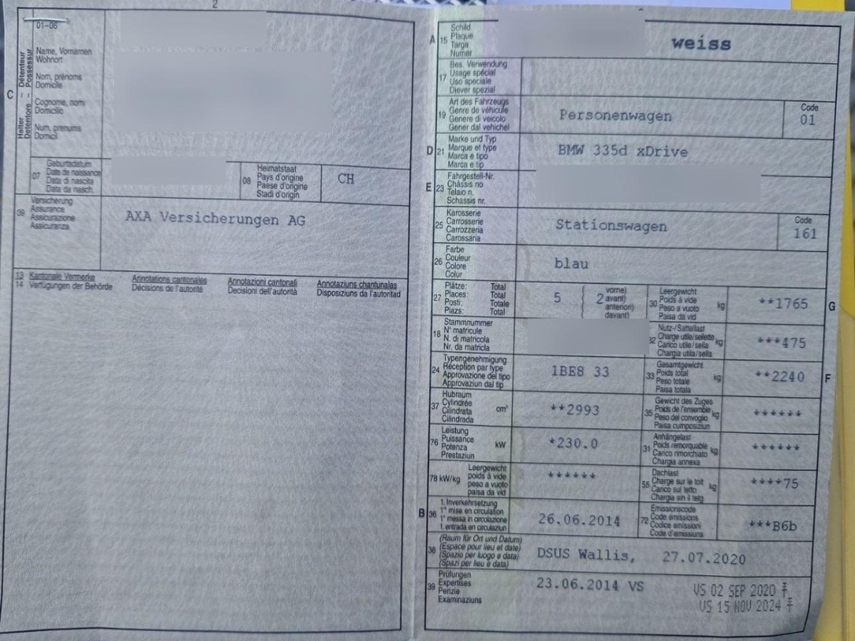 Sonnenschutzverglasung, Fahrwerk: Variable Sportlenkung Für sportliches Fahren gesteigertes Handling und agilere Ausweichmanöver, Xenon-Scheinwerfer inkl. Hochdruck- Scheinwerferwaschanlage und Leuchtweitenregulierung, Armauflage vorne, verschiebbar, Innenspiegel automatisch abblendbar, Speed Limit Info inkl. Überholverbots- anzeige, Sitze: Kopfstützen hinten abklappbar, Scheinwerfer-Waschanlage, Navigationssystem Professional, Dachreling schwarz, Assist: Park Distance Control vorne und hinten, Instrumentenkombination mit erweiterten Umfängen, BMW Garantie: 3 Jahre oder 100’000 km Gratis-Service: 10 Jahre oder 100’000 km (ab 1. Inv.), Regensensor für Scheibenwischer vorne, BMW Individual Dachhimmel Anthrazit, Media: Komforttelefonie mit erweiterter Smartphone-Anbindung, M-Lederlenkrad, Metallic-Lackierung, Sportsitze vorne, inkl. Sitzhöhen- verstellung, Ablagenpaket, Shadow Line glänzend, Ohne Modellbezeichnung, 8-Stufen Sportautomat sequentiell, Lichtpaket, Sitze: Vordersitze heizbar, HiFi Lautsprechersystem, Raucherpaket, Akzentleisten Estoril Blau matt, Akzentleisten schwarz hochglänzend, Interieurleisten Aluminium Hexagon, M Leichtmetallräder Sternspeiche 400 M, 18J mit Mischbereifung, M-Technic Aerodynamic-Paket, Stoff ”Hexagon” /Alcantara