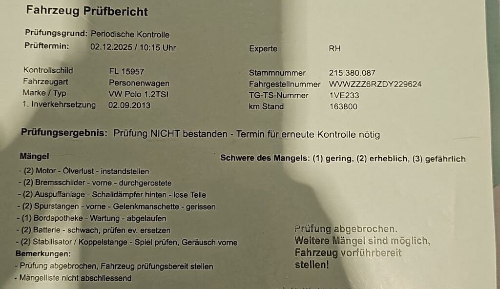 Keine technische Prüfung (Werkstatttest) vorgenommen