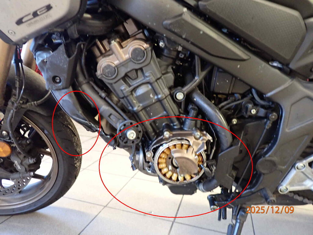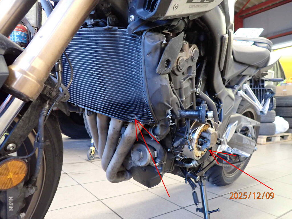 Flanc gauche et droite endommagé. Carter embrayage cassé. Radiateur cassé. Aucune information sur l’état du moteur