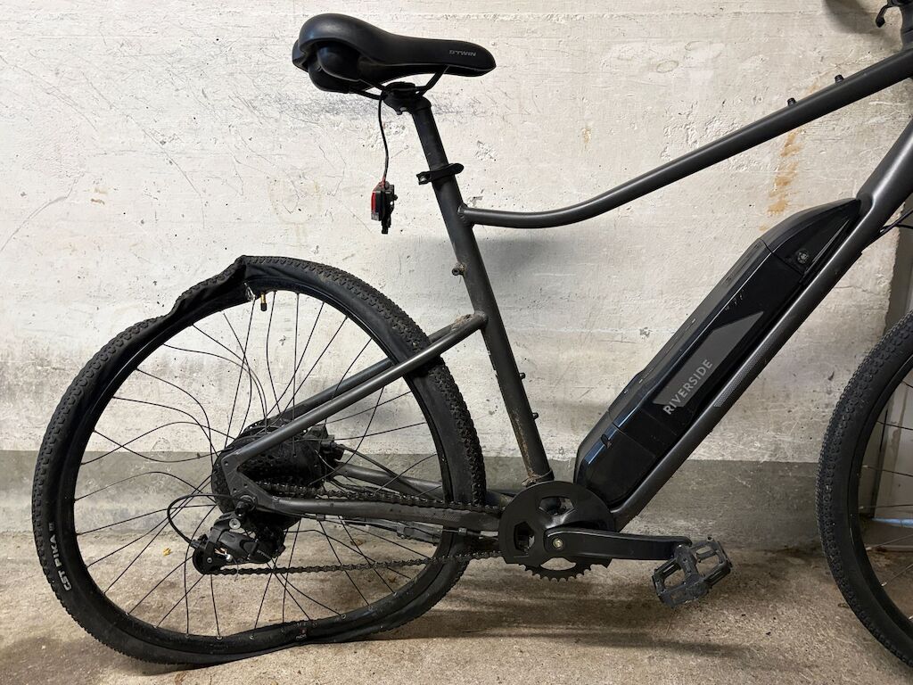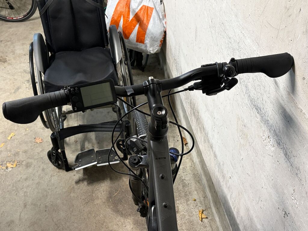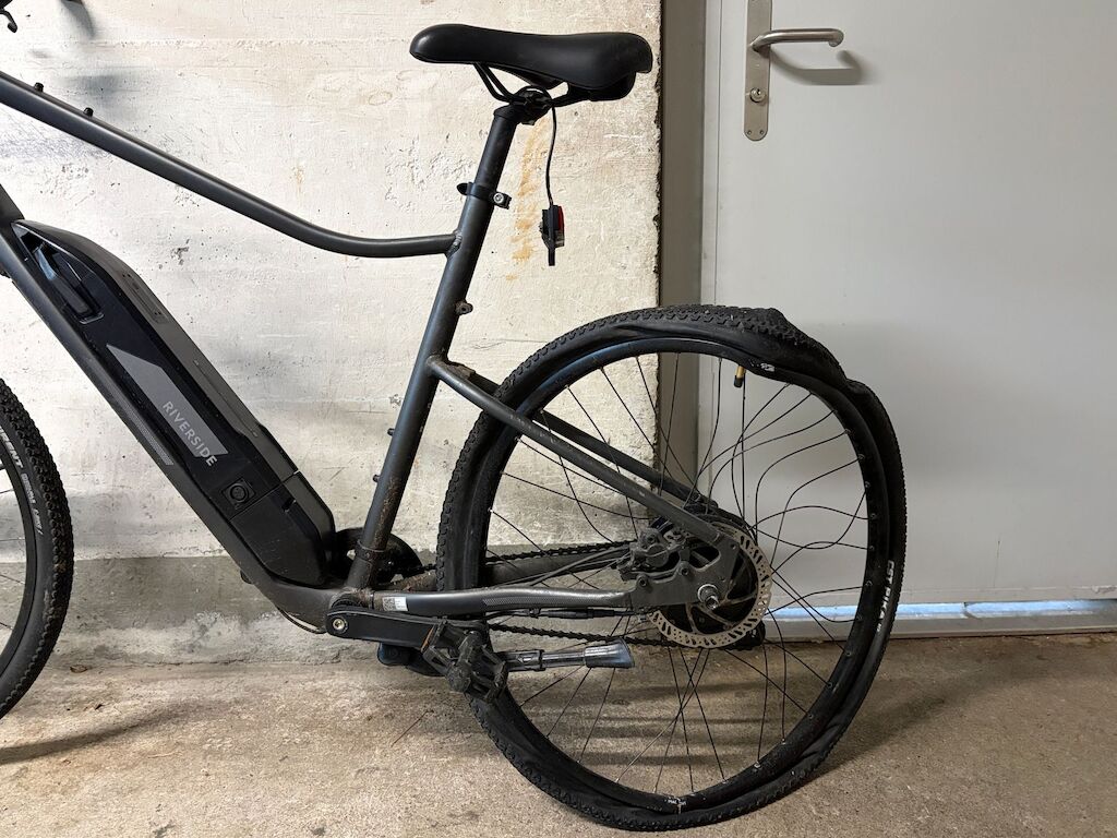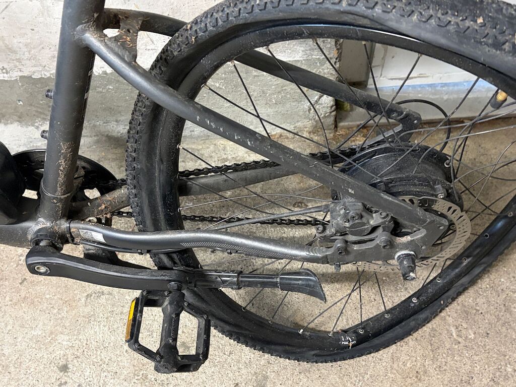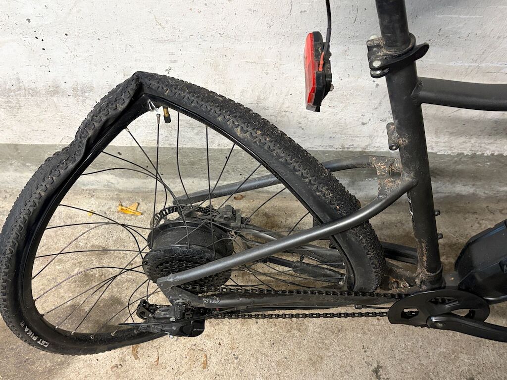 Kollisionsschaden Heck, mit Beschädigung des ganzen Velos ringsum.