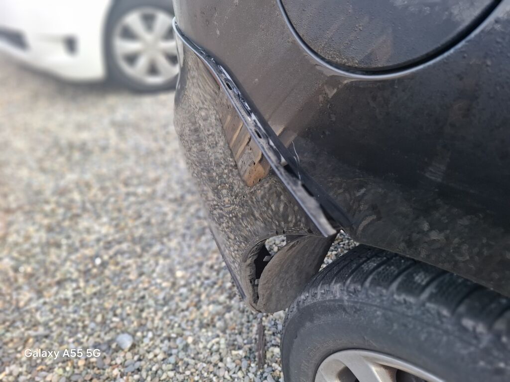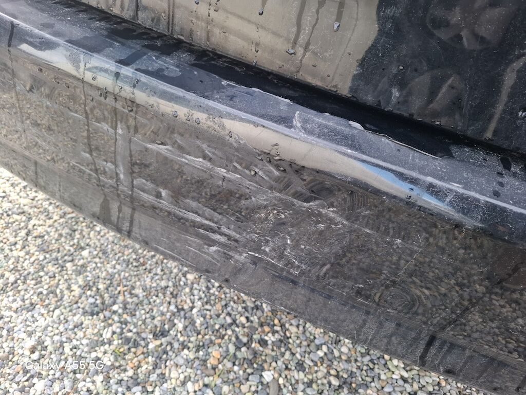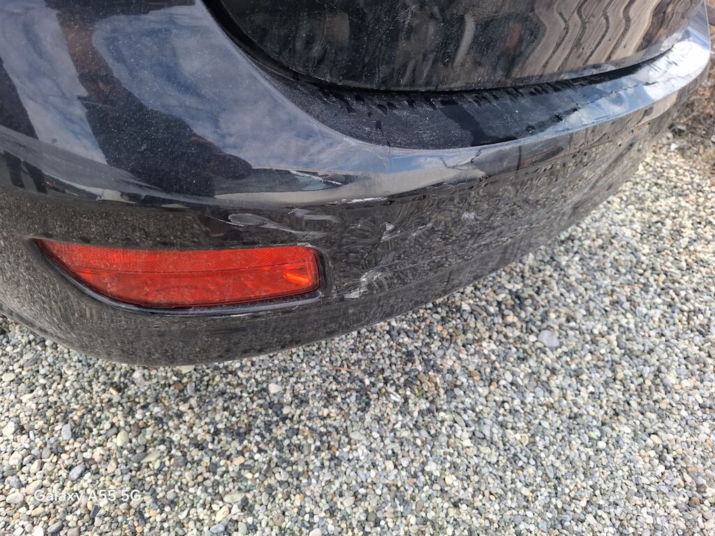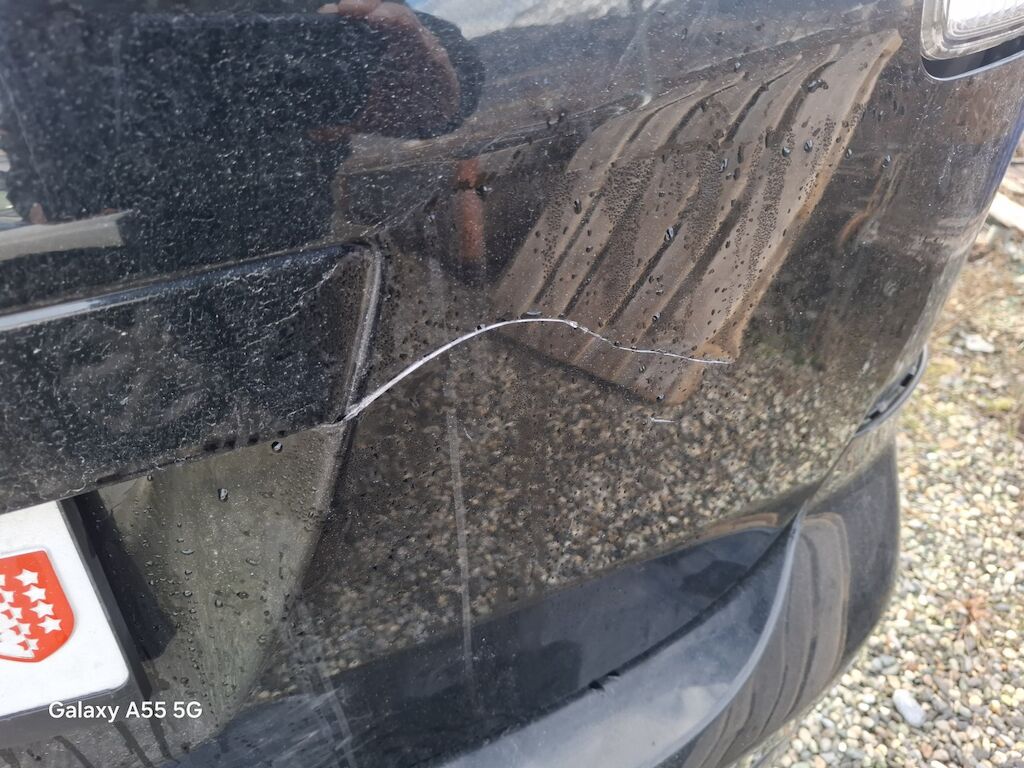 Dommage arrière: enveloppe de pare chocs hayon en matière synthétique impactés cassés fissurés éclatés endommagés, jupe pliée déformée endommagée.