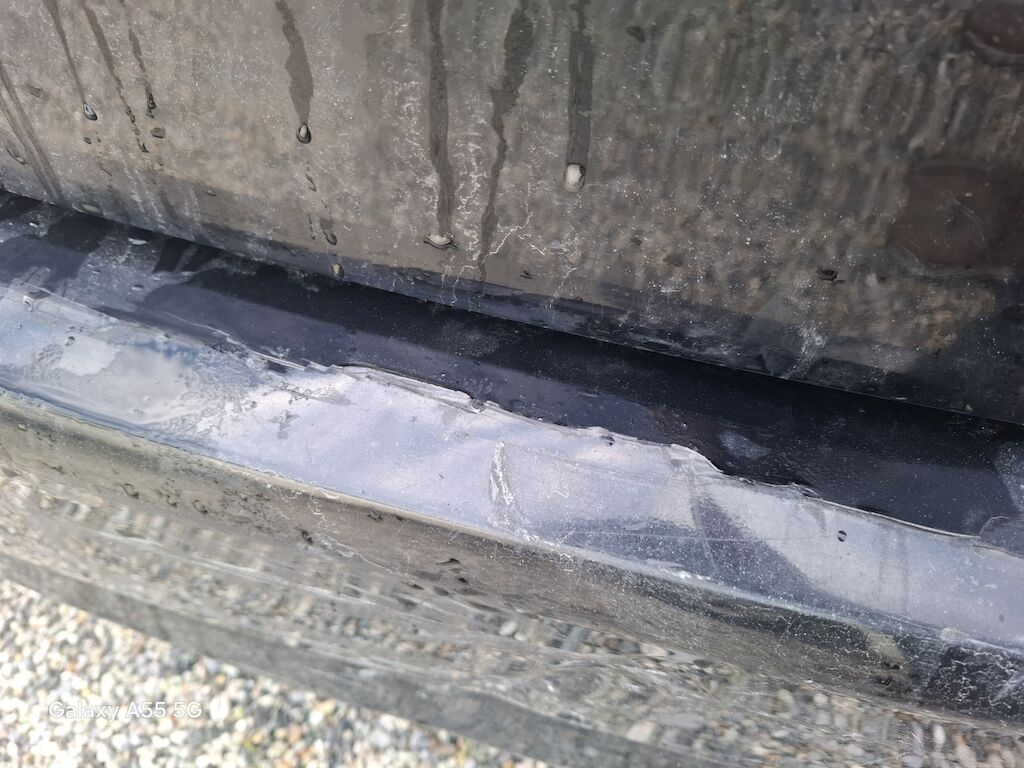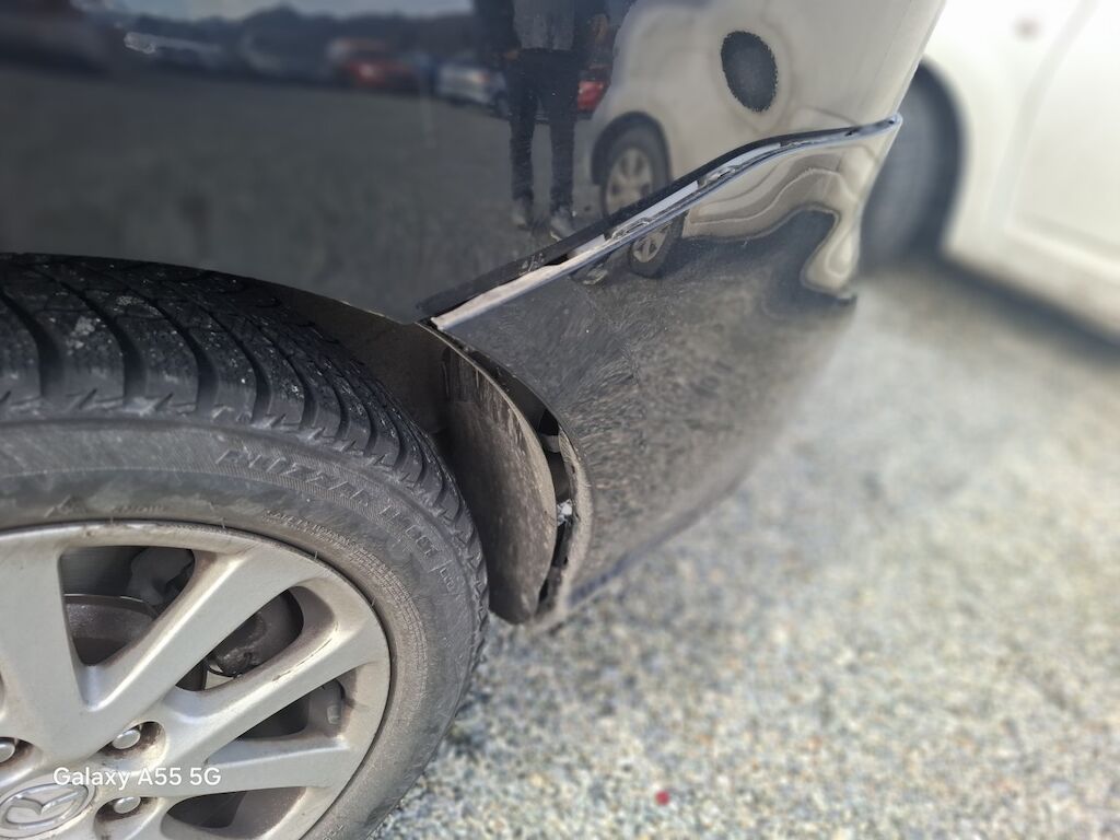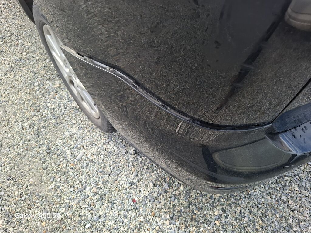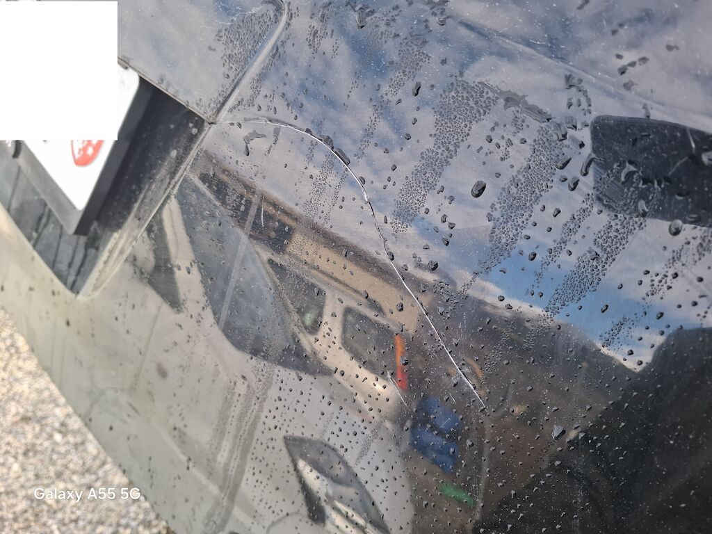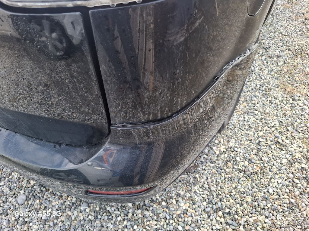 Dommage arrière: enveloppe de pare chocs hayon en matière synthétique impactés cassés fissurés éclatés endommagés, jupe pliée déformée endommagée.