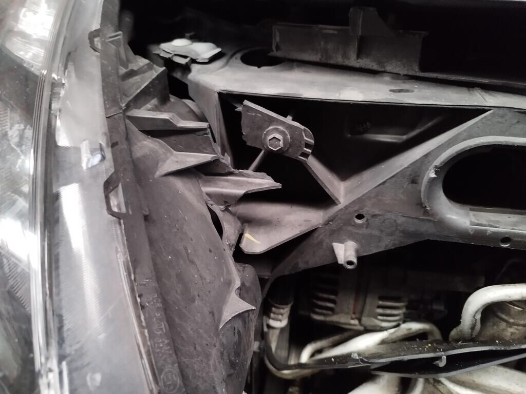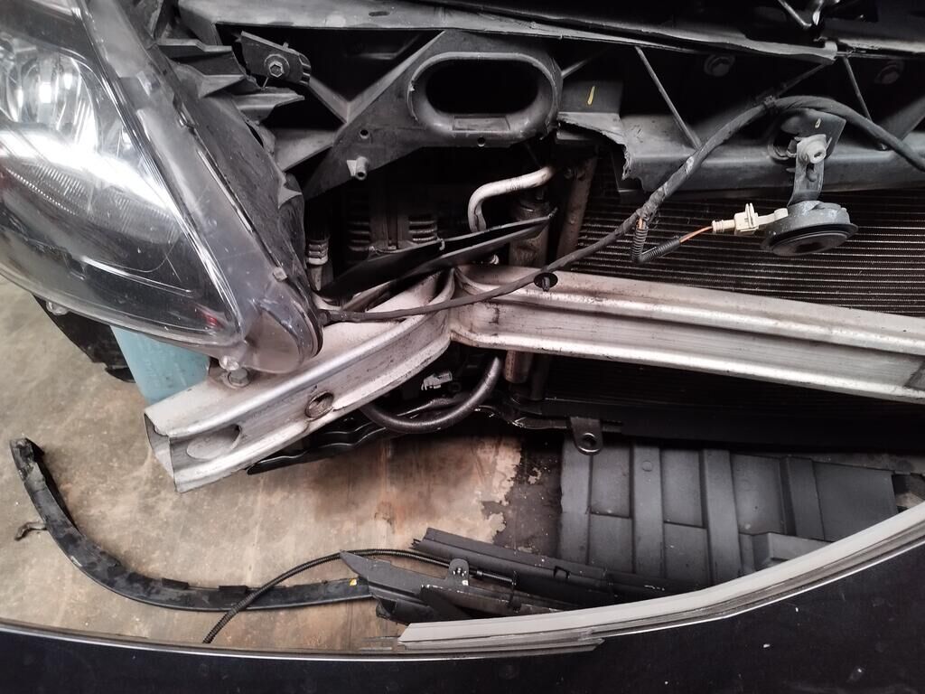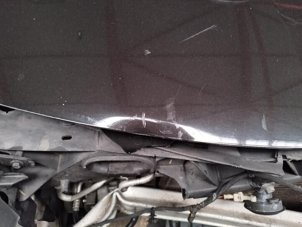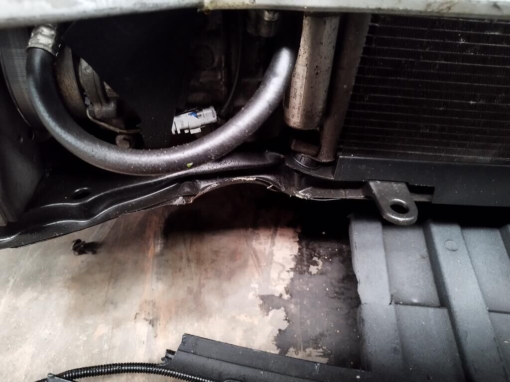Die ganze Front ist deformiert, die Motorhaube hat eine Delle, der Scheinwerfer vorne rechts ist gerissen, alle Kühler sind deformiert, diverse Leitungen der Klimaanlage sind deformiert und verbogen, der Alternator ist gerissen.