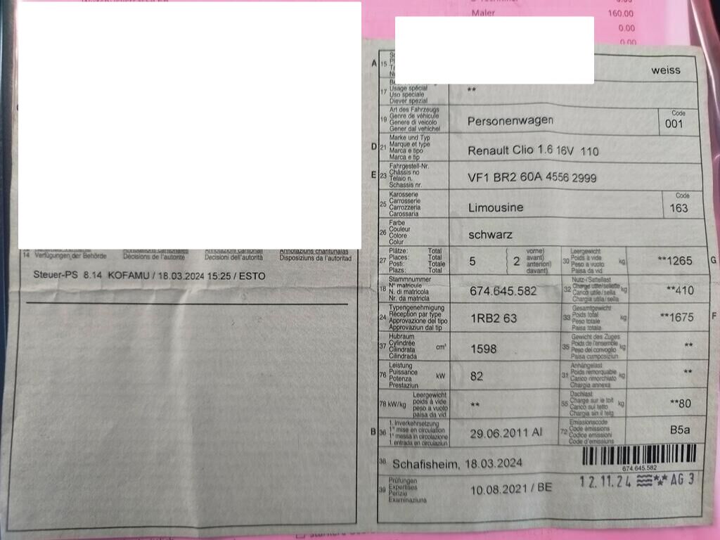 | Pneumatici | Achse 1: L: 4 mm, R: 4 mm, Dimension: 185/60 R15 Winter Achse 2: L: 4 mm, R: 4 mm, Dimension: 185/60 R15 Winter |