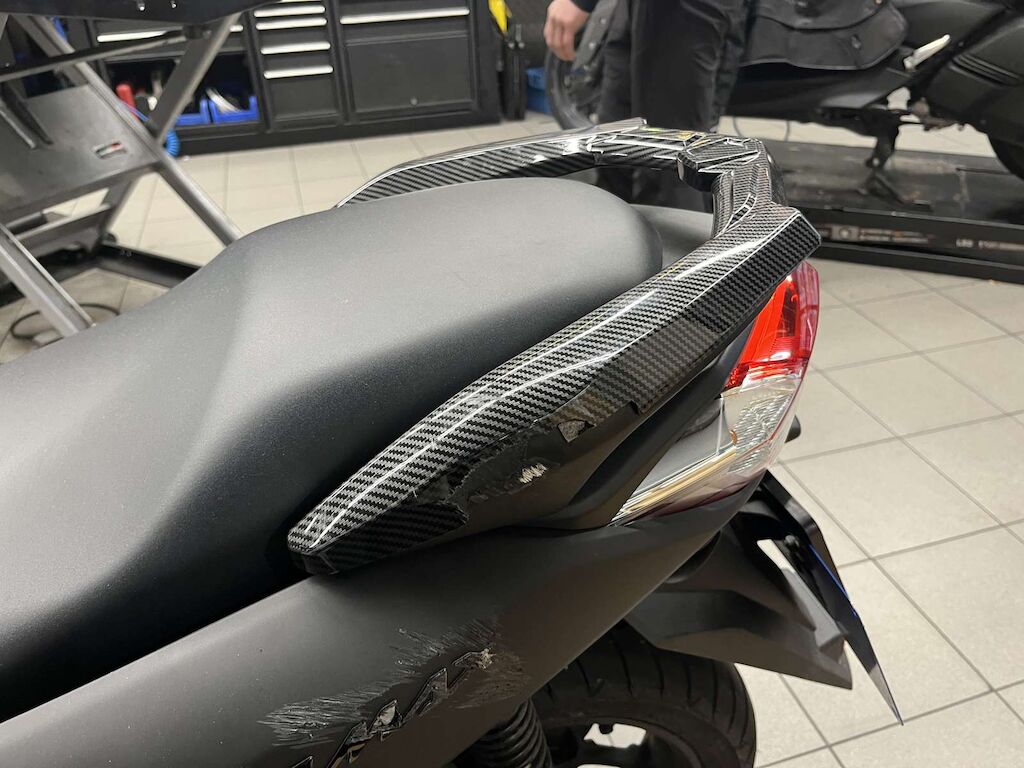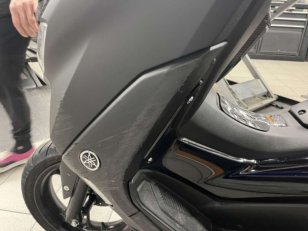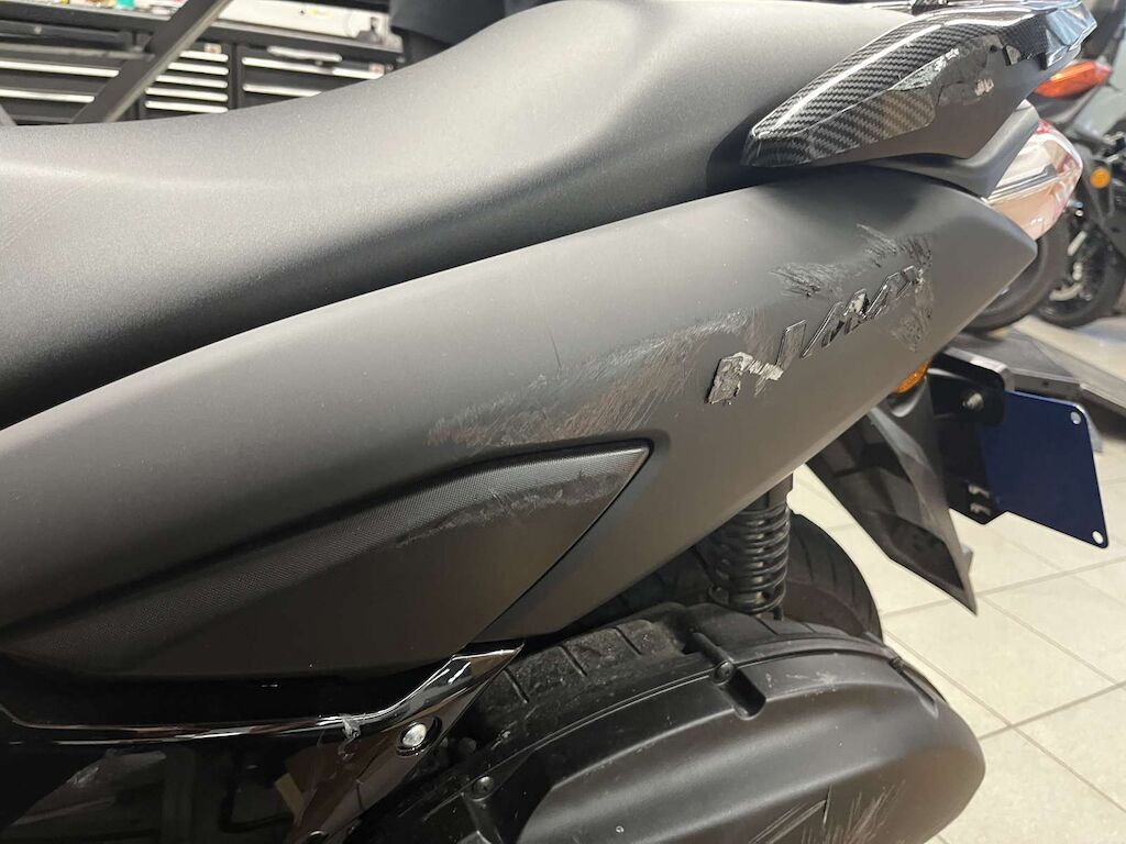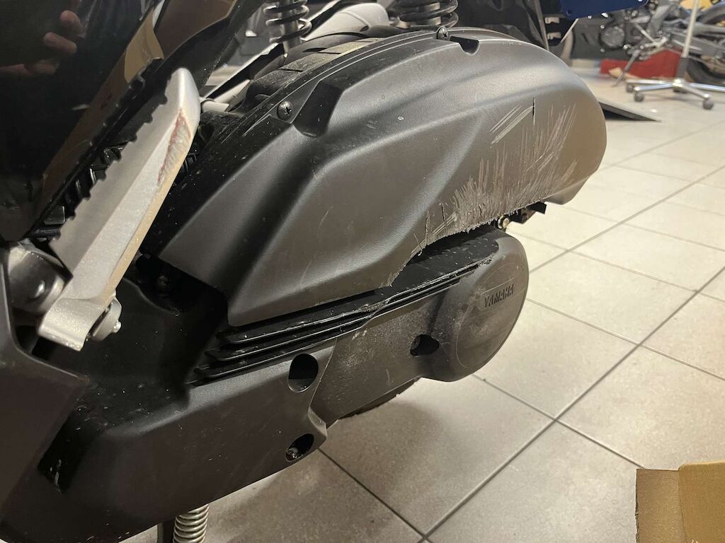 Pare-boue avant, Pare-brise, carénages avant gauche et droite, carénages latéraux gauche, béquilles, boite à air, carter variateur, poignée passager endommagés et râpés.