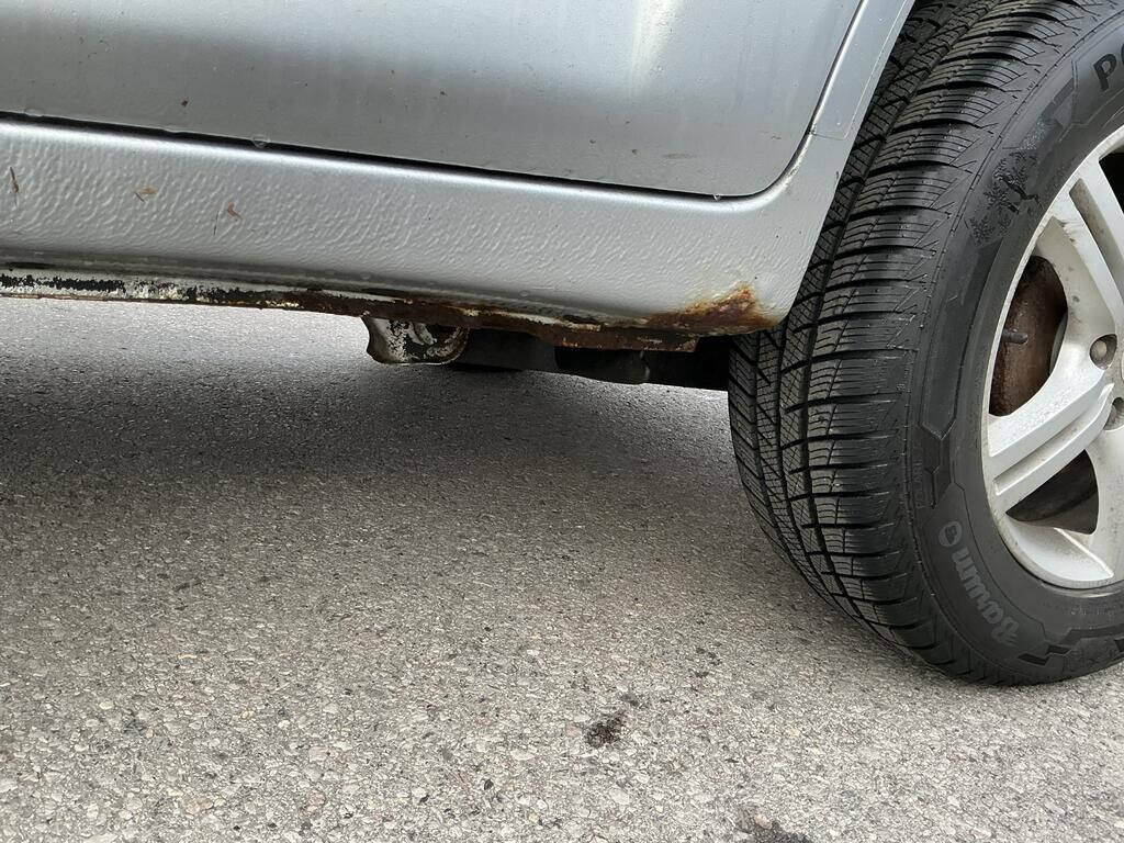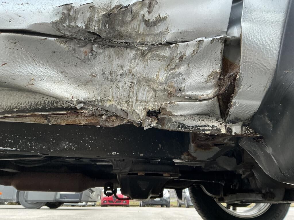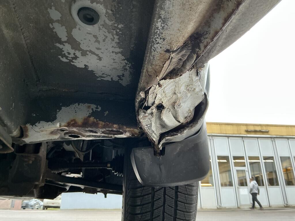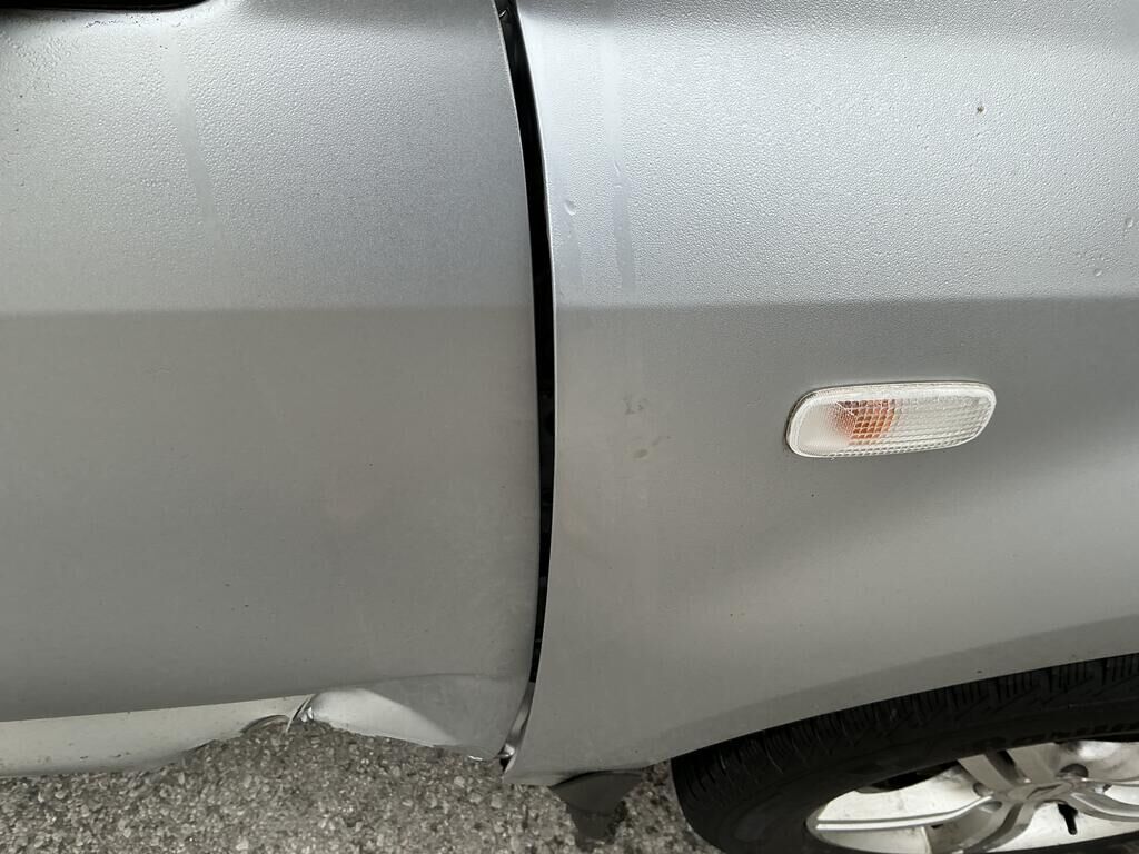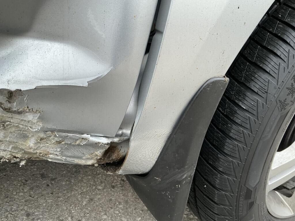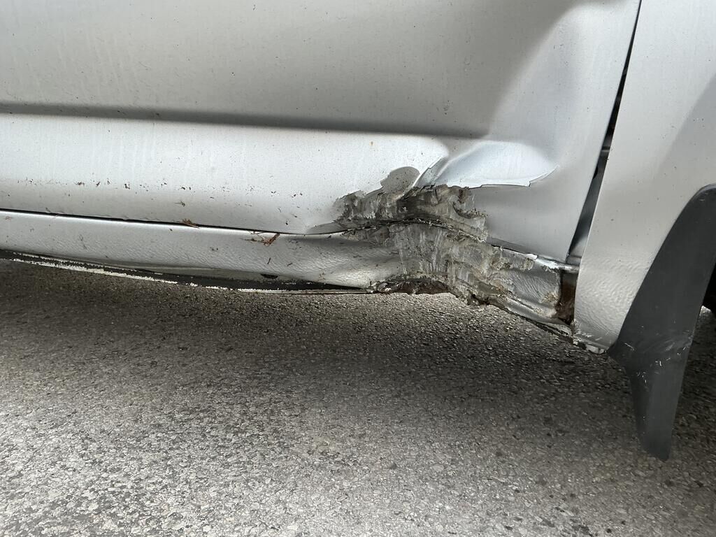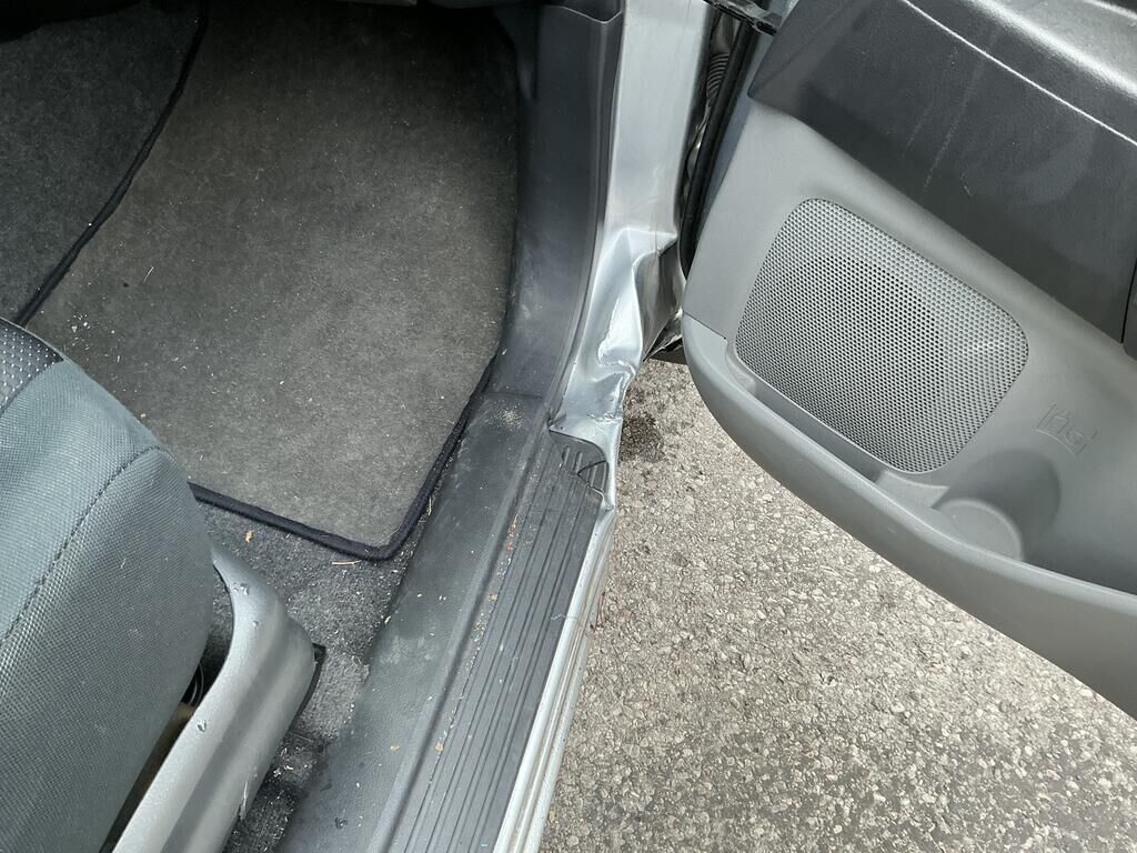 Tamponnement du flanc avant droit: porte, bas de caisse, aile, jante, pied avant inférieur et garniture de porte endommagés.