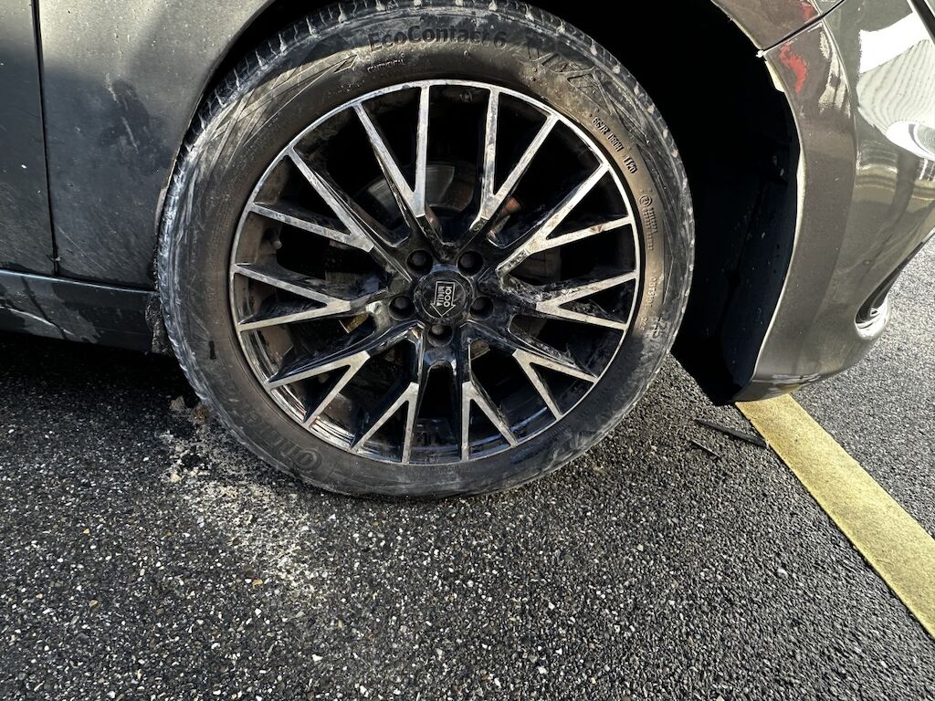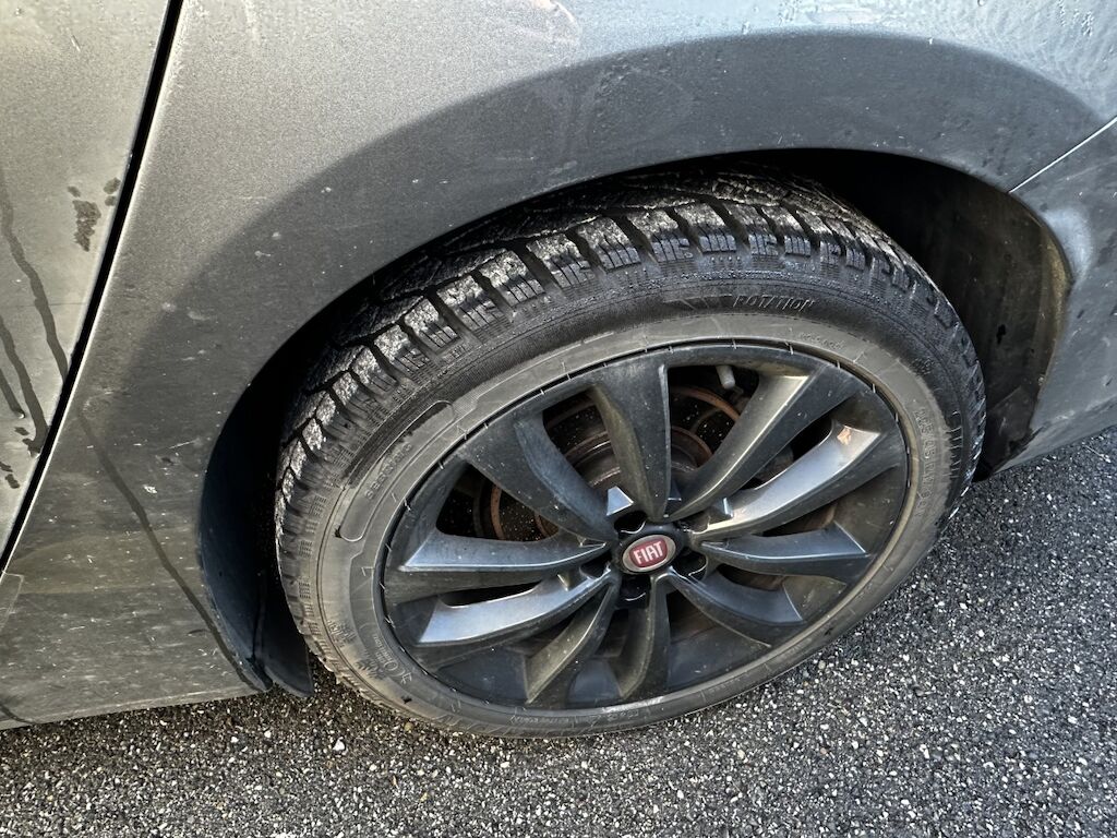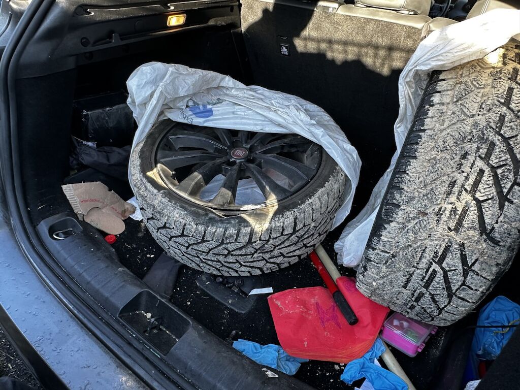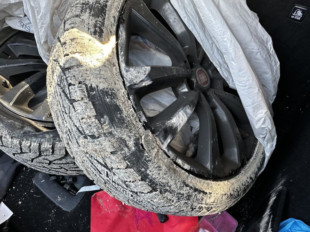 | Auf der Fahrzeugseite links wurde vorübergehend die Sommerräder montiert, die zwei fehlenden werden auch zum Fahrzeug gelegt. | |