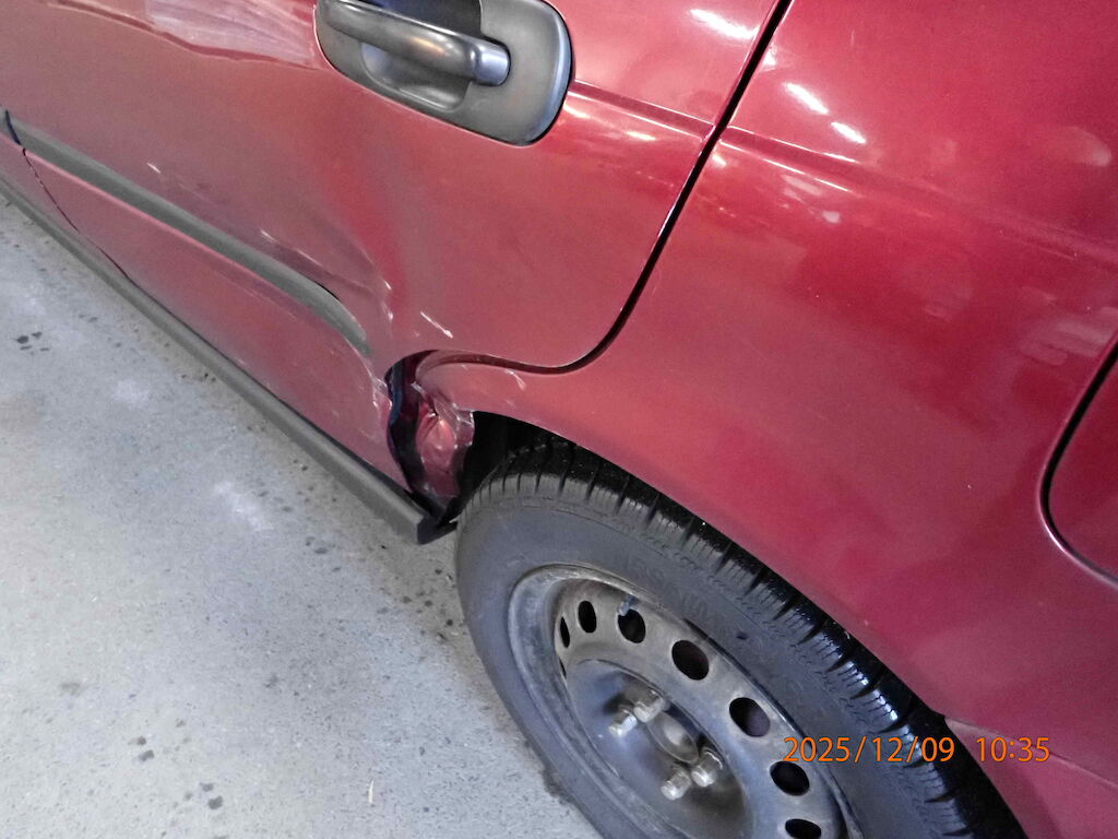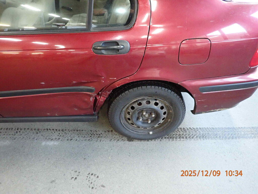 Offensichtlicher Totalschaden: Türe hinten links und Seitenwand hinten links beschädigt, Kratzer Stossstange hinten.
