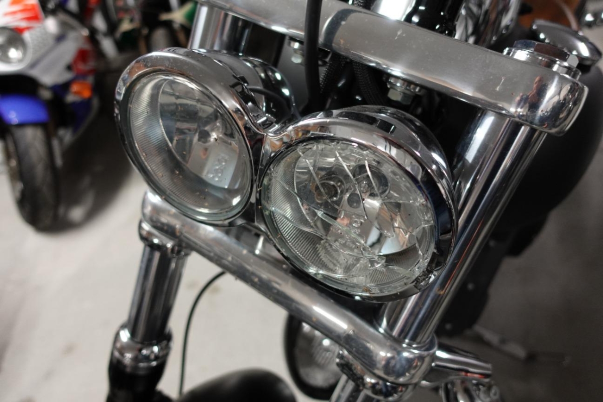 Auspufftopf, Aussenspiegel rechts, Diverse Anbauteile, Fussraster rechts, Gabelholm, Griff rechts, Lenker, Rahmen, Scheinwerfer, Seite rechts, Tank