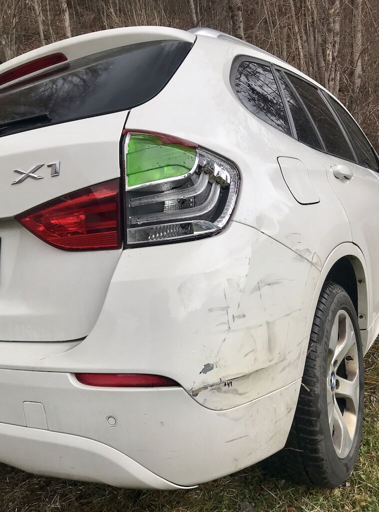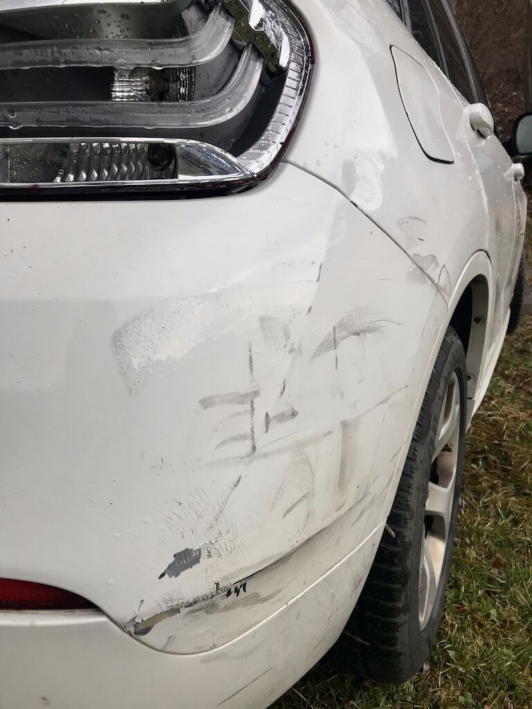 hinten Rechts Kratzer, Lack Schaden, kleine Beule, vermutlich Stossstange beschädigt.