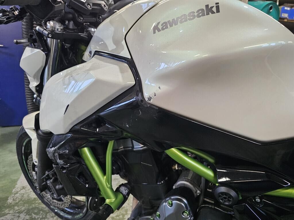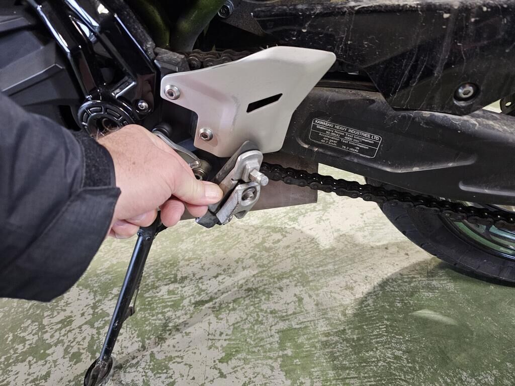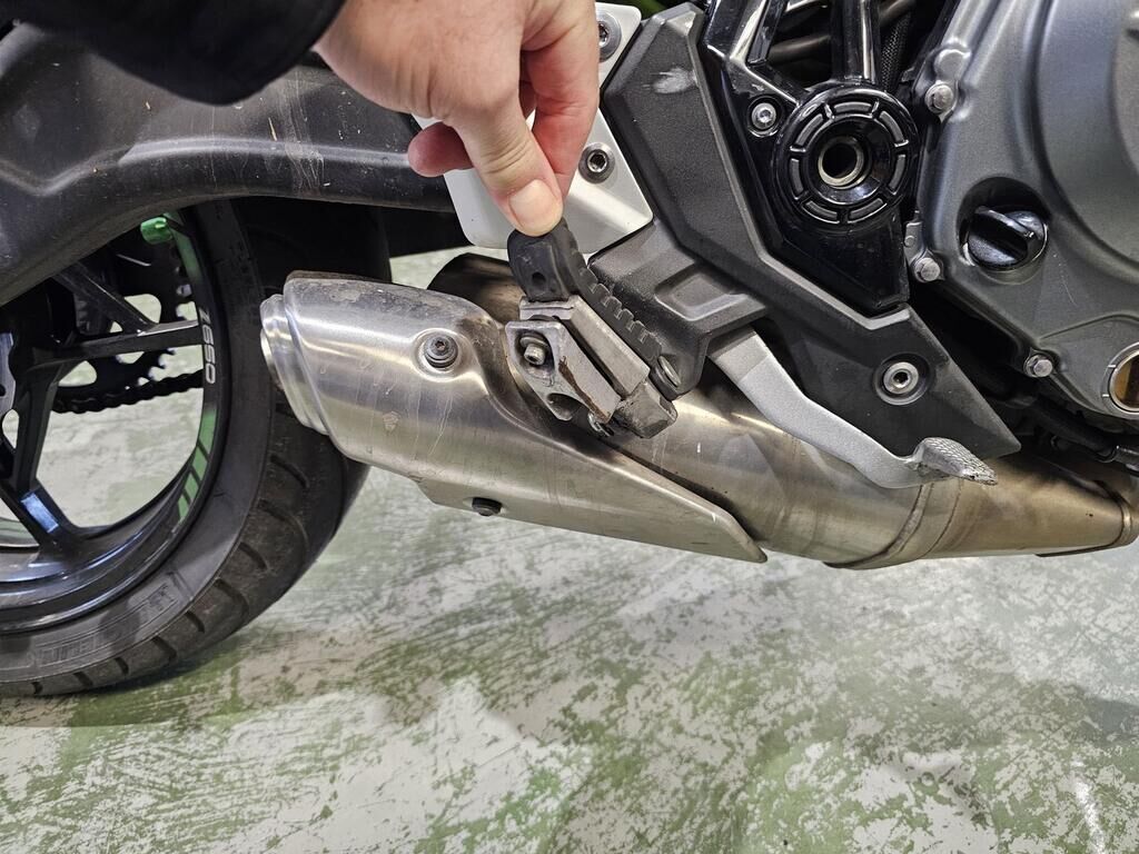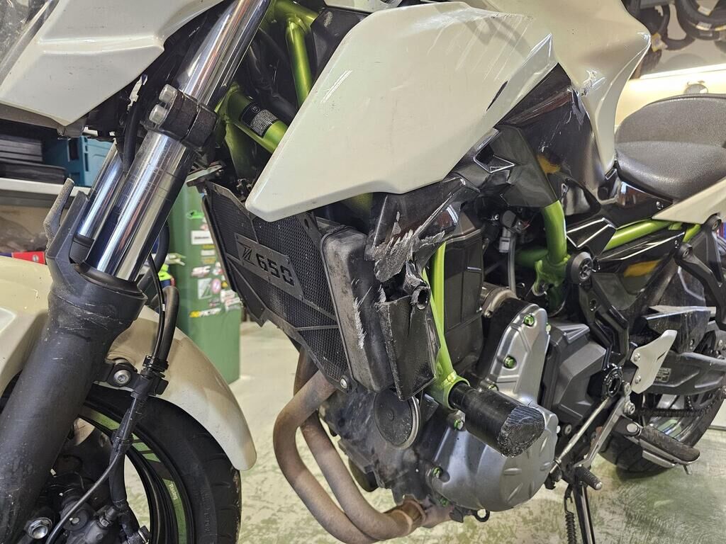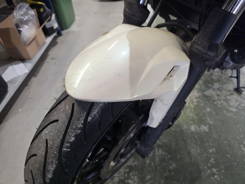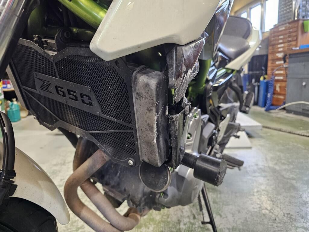 Choc latéral gauche : fourreau de fourche, clignoteur avant, levier d’embrayage, rétroviseur, commodo, poignée, guidon, écope, réservoir à carburant et cache inférieur, radiateur et déflecteur latéral, protecteur de chute, carter alternateur, béquille latérale, sélecteur vitesses, repose-pied conducteur, repose-pied passager et platine, supports béquille d’atelier, axe de roue arrière, carénage de selle.