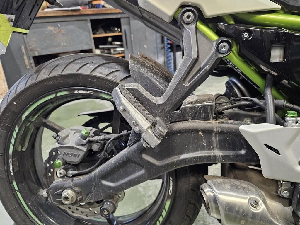 – Choc latéral droit : réservoir à carburant et cache inférieur, protecteur de chute, repose-pied conducteur, repose-pied passager et platine.