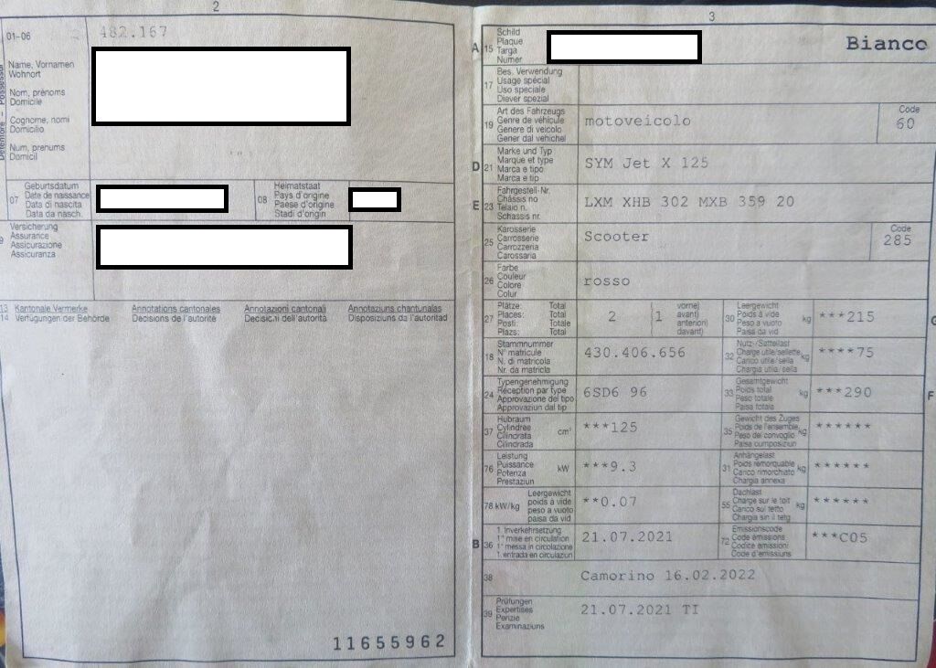 | Tipo veicolo / Costruzione / Porte | Motoveicolo / Scooter / 1 |