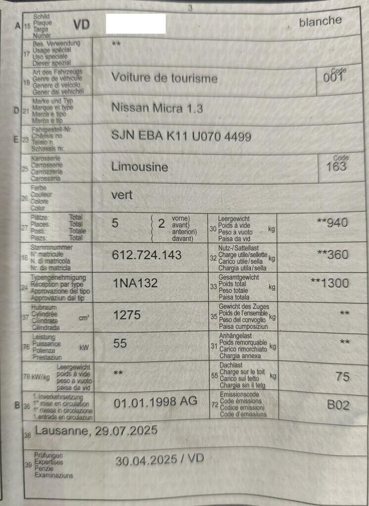| Pneumatici | Avant: Hiver en état moyen Arrière: Eté en état moyen. |
