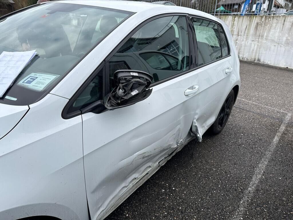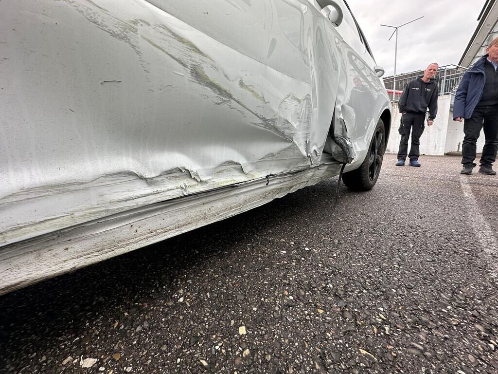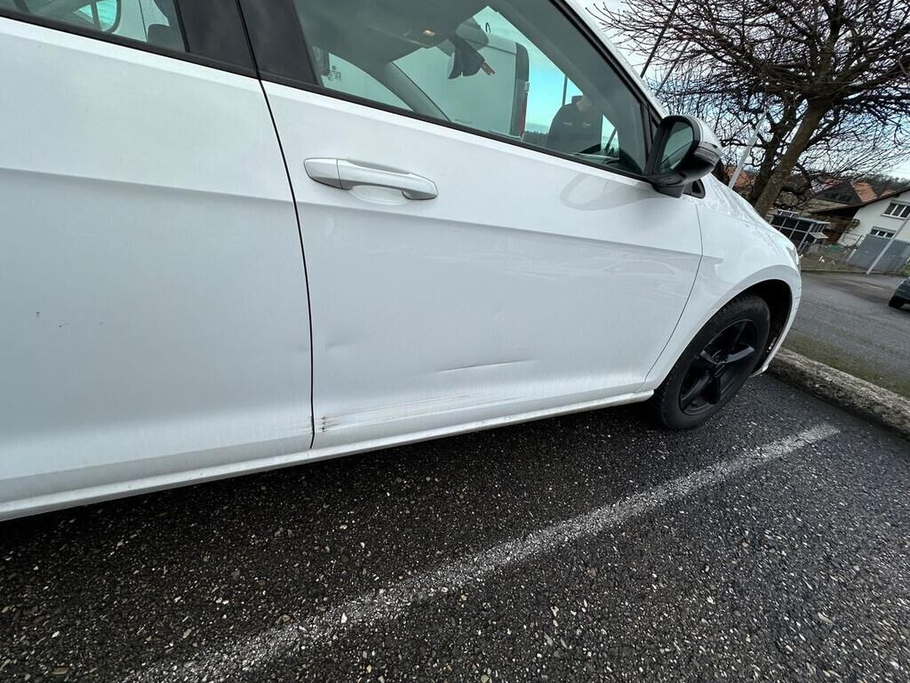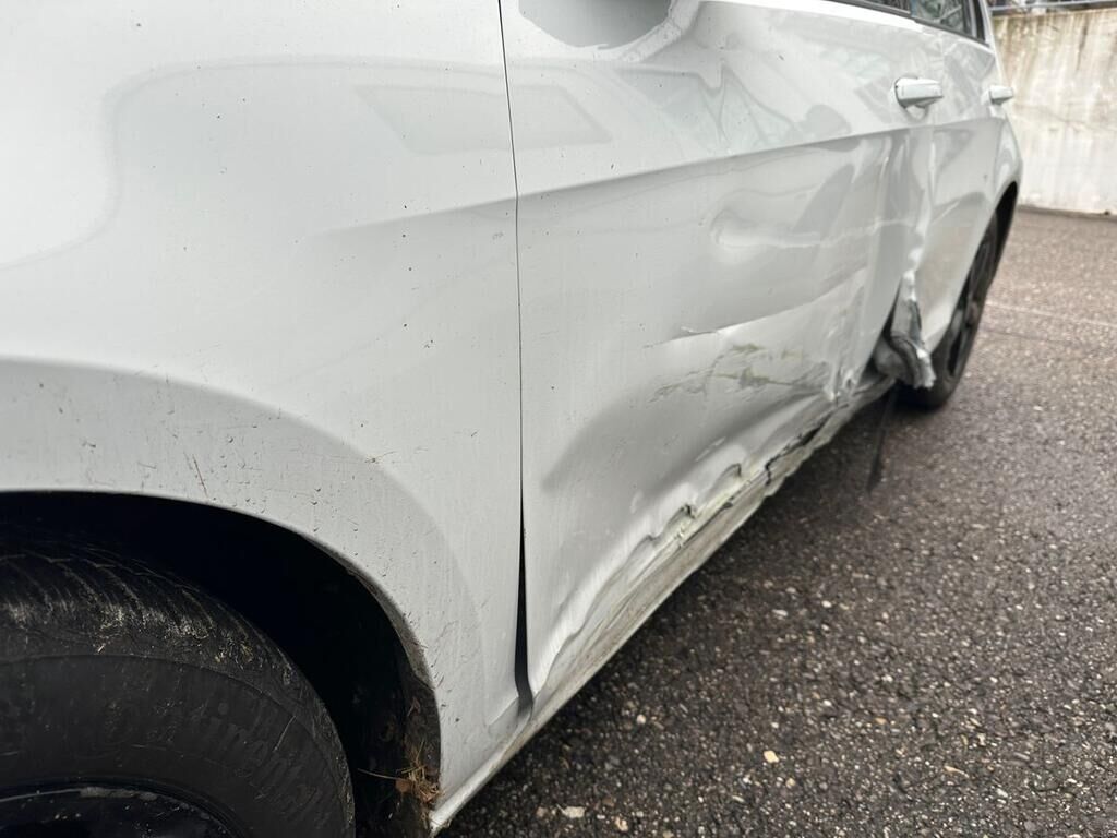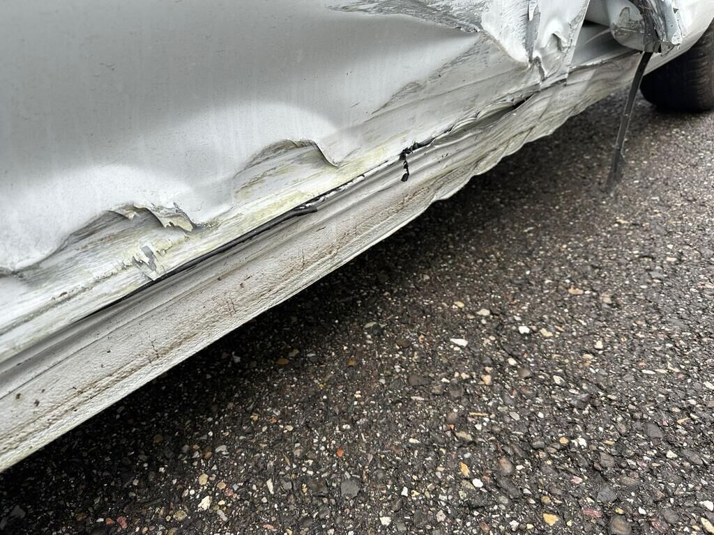 Anprall mit Deformation der Stossstange, Motorhaube, Felge, beide Türen und dem Schweller. Fahrertür lässt sich nicht öffnen.