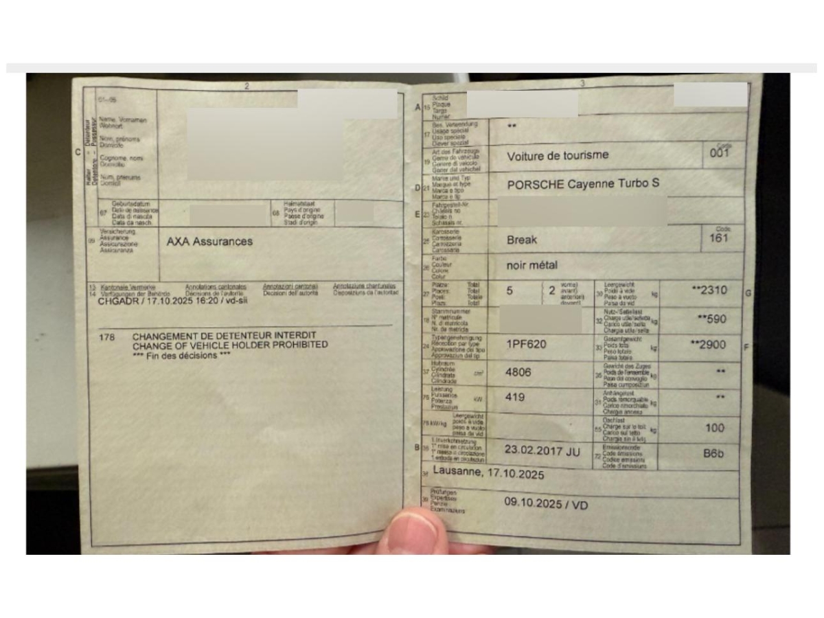 Bremsbelag-Verschleissanzeige, Airbag: Airbag Fahrer und Beifahrer, Licht: Nebelschlussleuchte, Airbag: Seitenairbag für Fahrer und Beifahrer, Ausstiegsleuchten in den Türen, Heckklappe automatisch, Bremssättel dunkelgrau lackiert, Heckscheibenheizung, Automatikgurt in Fondmitte, Licht: LED Heckleuchten, Räder: Reifenreparatur-Set mit Kompressor, Kraftstofftank 100 Liter, LED-Scheinwerfer inkl. Porsche Dynamic Light System Plus (PDLS Plus), Aussenspiegel rechts und links beheizt, elektrisch verstell- / und einklappbar, Fahrstabilisierungssystem Porsche – Stability-Management (PSM), Bordcomputer, Diebstahlwarnanlage mit Innenraumüberwachung, Nichtraucherausführung, Assist: Porsche Traction Management (PTM), Paket: Sport Chrono Paket, Tageskilometerzähler, Dachspoiler, Reduktionsgetriebe, Antriebsschlupfregelung (ASR), Licht: LED Blink- und Positionsleuchten, Sitze: Sitzheizung vorne und hinten, Getönte Scheiben, Porsche Active Suspension Management (PASM): Luftfederung inkl. Niveau- regulierung, Steckdose, Park Distance Control vorne und hinten, Sprachsteuerung, Leseleuchten hinten, Lackierung: Metallic-Lackierung, Interieur Paket Carbon, Porsche Communication Management (PCM) – inklusiv erweitertem Navigationsmodul, Adaptive Sportsitze inkl. Komfort- Memory-Paket, Wegfahrsperre elektronisch, Elektronische Parkbremse, Adaptives Bremslicht, Digital Uhr, Gurtwarneinrichtung für Fahrer- und Beifahrersitz, Keramik-Bremsanlage, Porsche Dynamic Chassis Control (PDCC), Mittelkonsole mit Ablagefach, Innenspiegel und Aussenspiegel links automatisch abblendend, Einstiegsschienen vorne, Armauflage Mittelkonsole vorn mit integriertem Ablagefach, Sitze: Komfortsitze vorne elektr. verstellbar, Tankdeckel-Entriegelung von innen, Aussentemperaturanzeige, Katalysator geregelt, Lenkrad: Lenkrad längs- und höhenverstellbar, Media: Bose Surround Soundsystem, Pollenfilter (Staubfilter), Vordersitze höhenverstellbar, Dachhimmel in Alcantara, Ablagefach in Armlehne hinten, 3-Punkt-Sicherheitsgurte auf allen Plätzen, Radnabenabdeckung mit Wappen farbig, Dachspoiler in Wagenfarbe, Veloursfussmatten vorne und hinten mit Logo, Airbag: Window-Kopfairbags, Airbag: Airbag Beifahrer deaktivierbar, Media: 2 USB-Schnittstellen hinten, Start/Stop-Funktion, Höhenverstellbare Gurten vorne, Bremsassistent (BAS), Heckscheiben-Wisch-/Waschanlage, Gurtstraffer vorne und hinten, Aktivkohlefilter, 3 Kopfstützen hinten, Vorbereitung für Handy, Allradantrieb permanent, Antiblockiersystem (ABS), Drehzahlmesser, Steckdose 12V, Polster: Leder-Ausstattung, Berganfahrhilfe (Hill Assist Control -HAC), Scheibenwischer vorne mit Intervall, Assist: Tempomat, Laderaumabdeckung, Sitze: Rücksitzlehne geteilt abklappbar, ISOFIX Kindersitzvorrichtung, Multifunktionslenkrad beheizbar, AUX-Anschluss, 4 Leichtmetallräder Cayenne Turbo Rad 19J, Getriebe: 8-Stufen-Automat sequentiell, Stabilisatoren vorne und hinten, Servotronic, Beide Make up-Spiegel beleuchtet, Innenlicht-Abschaltverzögerung, Elektrische Fensterheber vorne + hinten, Kofferraum-Entriegelung von innen, Oeldruckanzeige, Licht: Fahrlichtassistent (automatisches Fahrlicht), Wartungsintervall-Anzeige, Räder: Reifendruckkontrollsystem ( RDK ), Multifunktionsanzeige, Vorbereitung für Anhängevorrichtung, Assist: Seitenaufprall-Schutzsystem, Zentralverriegelung mit Fernbedienung, Leseleuchten vorne, Fussraumbeleuchtung vorne und hinten, Klimatisierungsautomatik, Licht: LED-Tagfahrlicht, Kopfstützen exclusive, Türgriffe aussen in Wagenfarbe, LED Nebelscheinwerfer