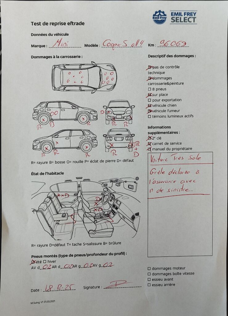 | Sinistre pour la grêle déclaré à l’assurance. La voiture est vendue avec le numéro de sinistre pour effectuer la réparation de la grêle. | |