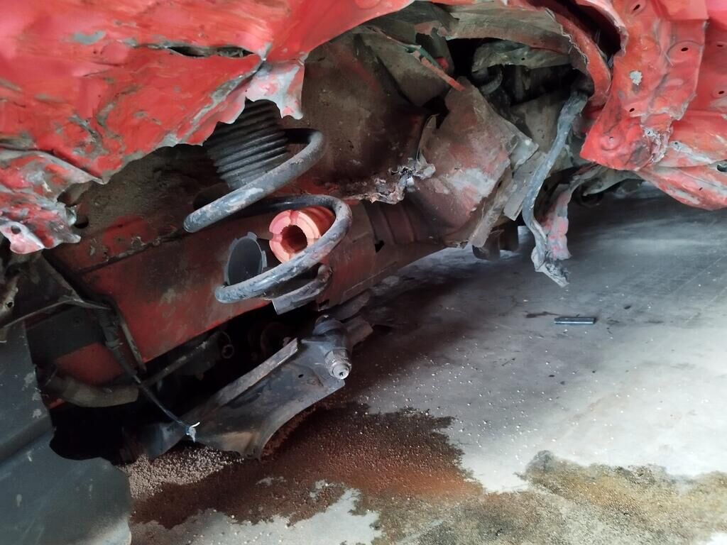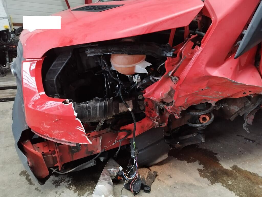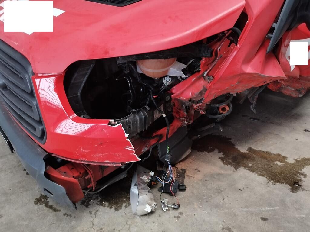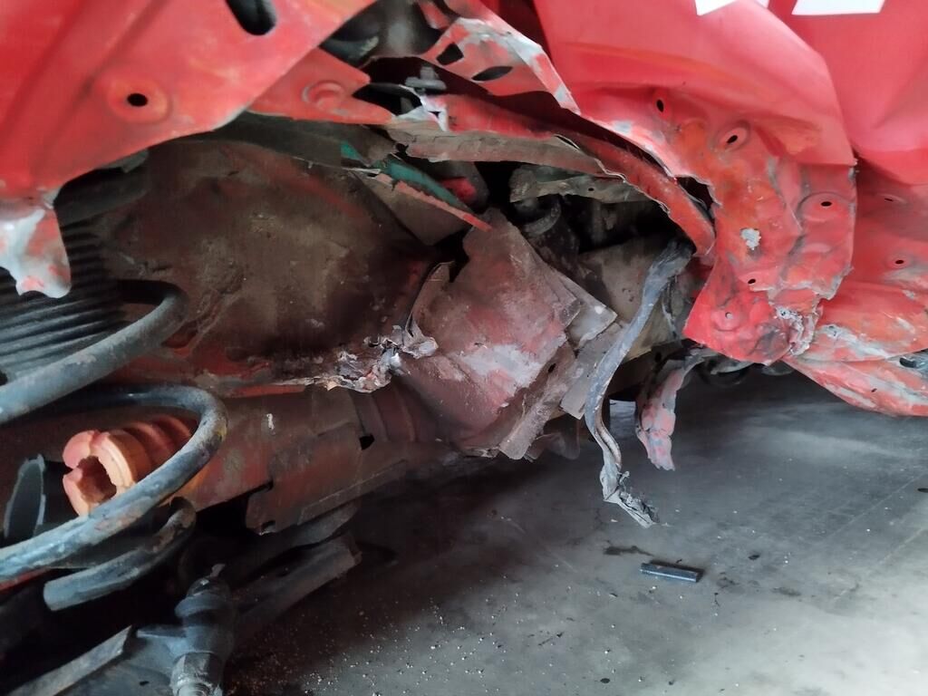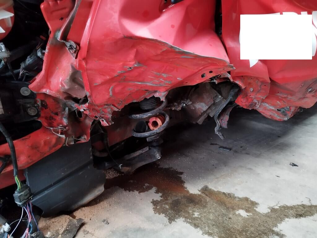 Die ganze Front links ist deformiert, die Aufhängung vorne links ist abgerissen, beide Airbags sind ausgelöst, alle Gurtstraffer sind ausgelöst, die Frontscheibe ist gerissen, der Aussenspiegel rechts ist gerissen, die Türe rechts ist deformiert, der Kotflügel vorne rechts ist deformiert, das Rad vorne rechts steht schräg.