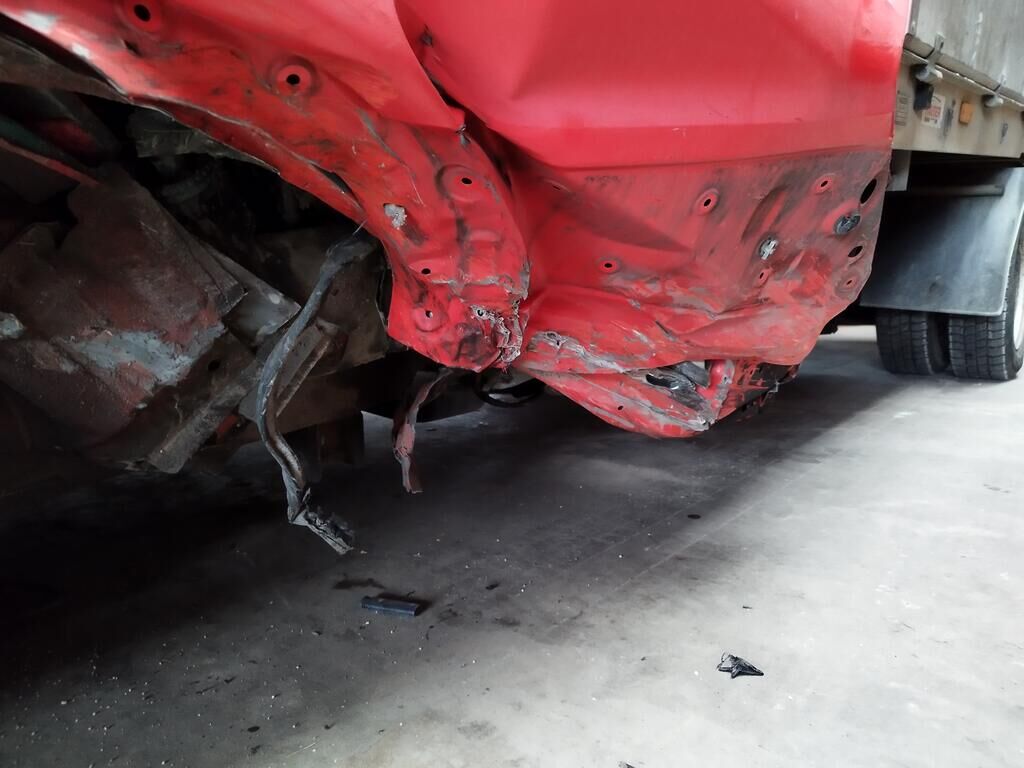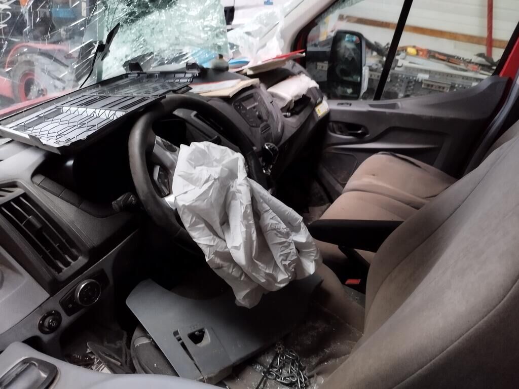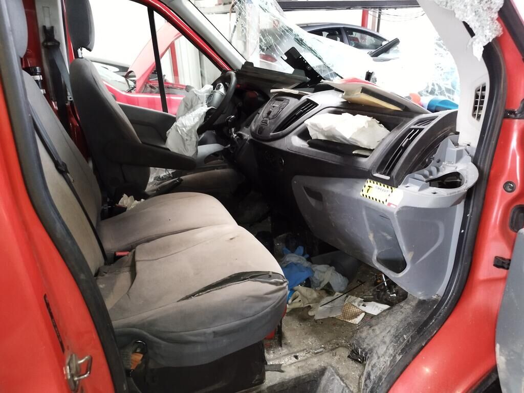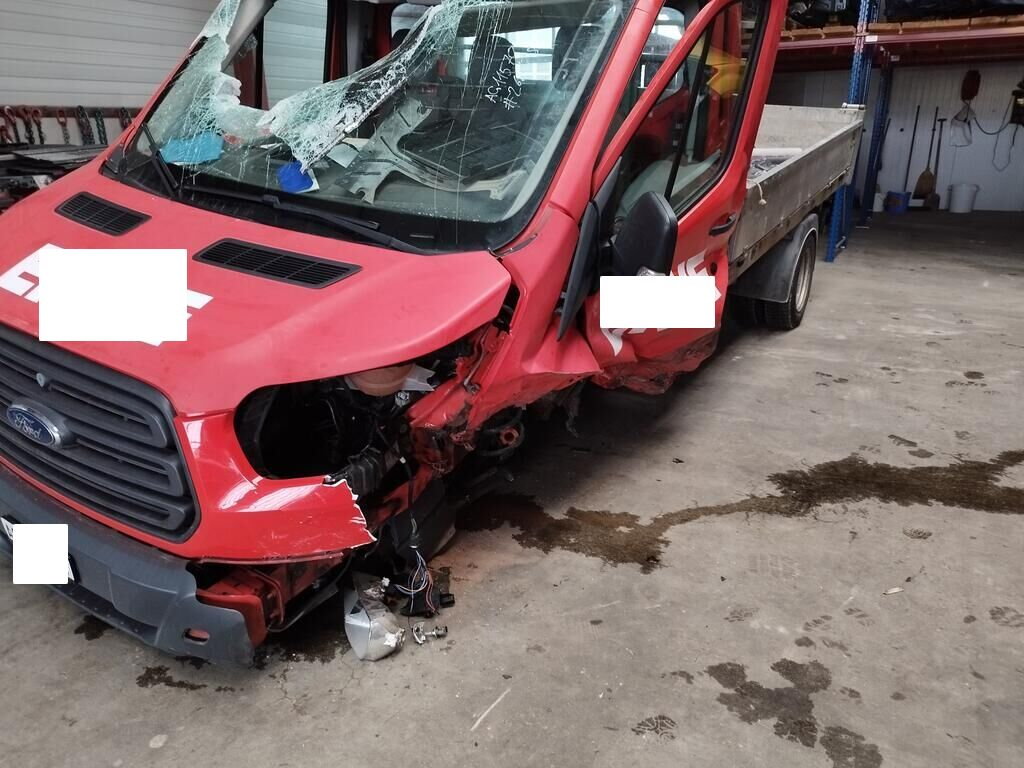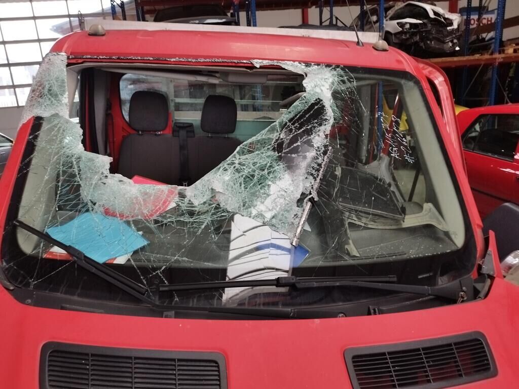Die ganze Front links ist deformiert, die Aufhängung vorne links ist abgerissen, beide Airbags sind ausgelöst, alle Gurtstraffer sind ausgelöst, die Frontscheibe ist gerissen, der Aussenspiegel rechts ist gerissen, die Türe rechts ist deformiert, der Kotflügel vorne rechts ist deformiert, das Rad vorne rechts steht schräg.