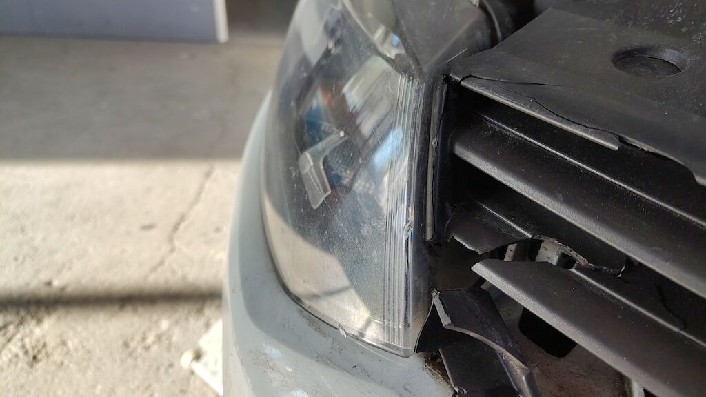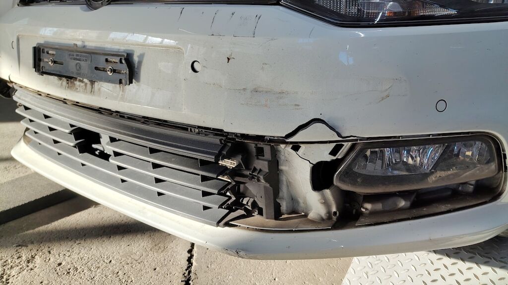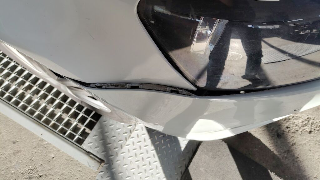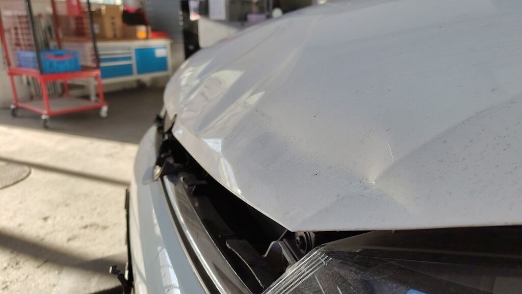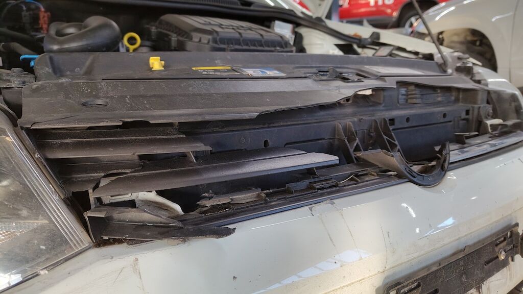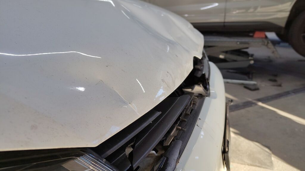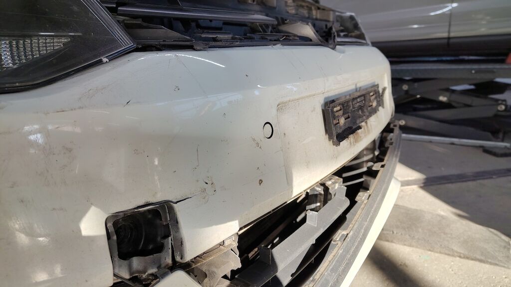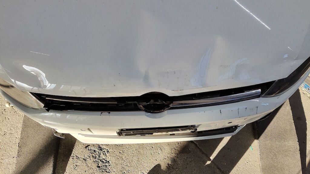 Frontschaden: Motorhaube eingedellt und zerkratzt. Kühlergrill gerissen. Schlossträger gebrochen. Ziergitter links, rechts und mittig gebrochen/zerkratzt. Scheinwerfer links und rechts beschädigt. Haltebleche für Scheinwerfer beschädigt. Stossstange gerissen und zerkratzt, Parksensoren mitte beschädigt. Tagfahrleuchten links und rechts beschädigt. Fehlermeldung: Front Assist.