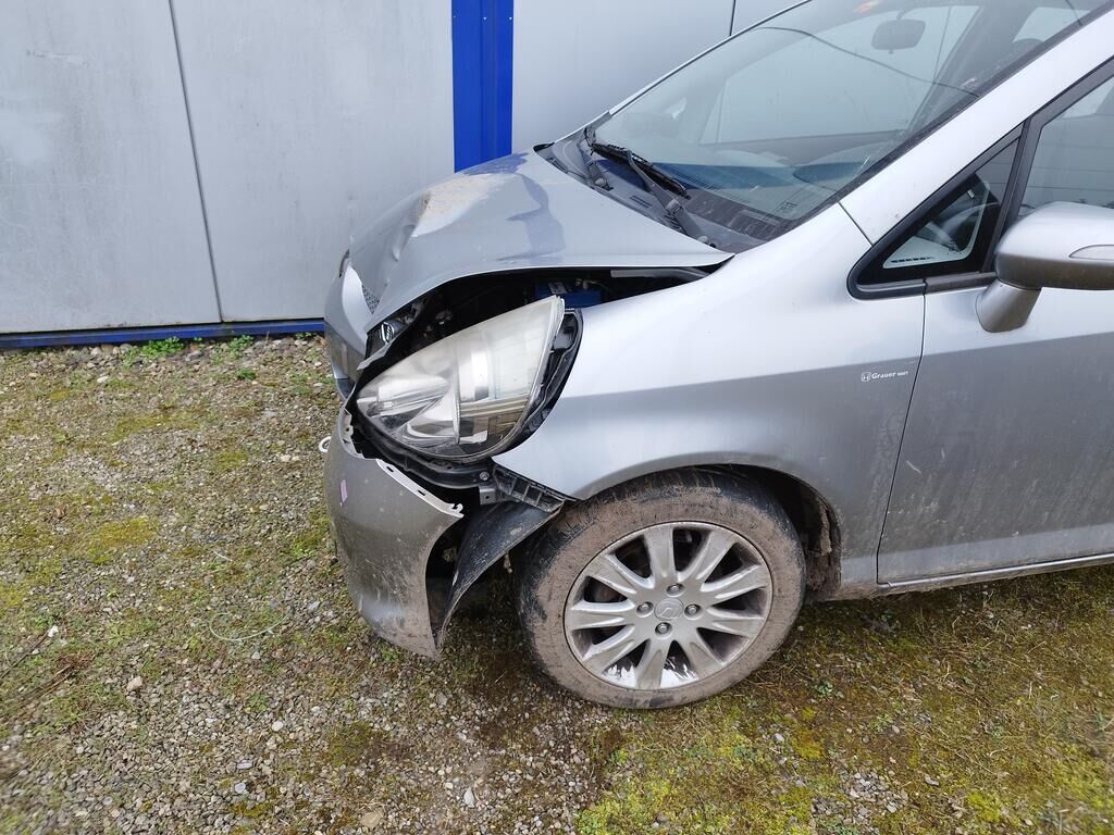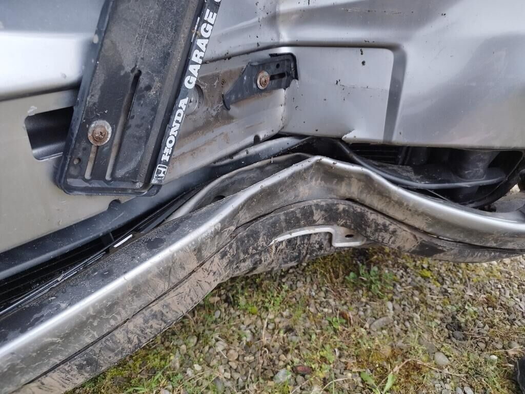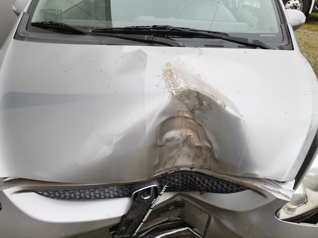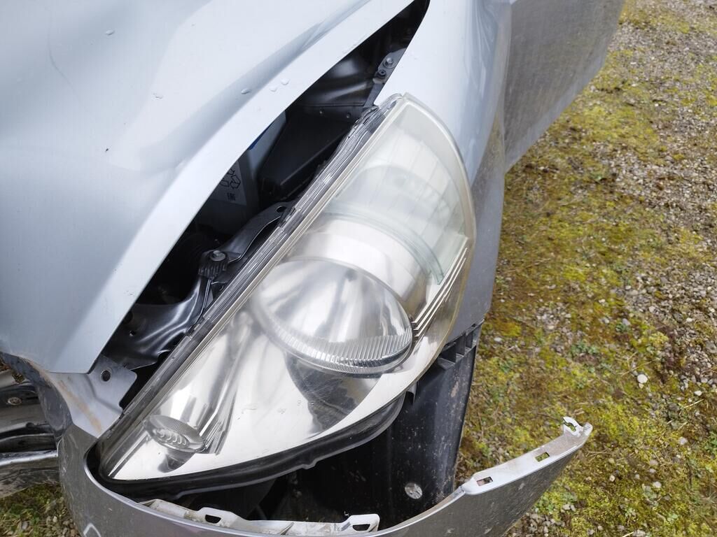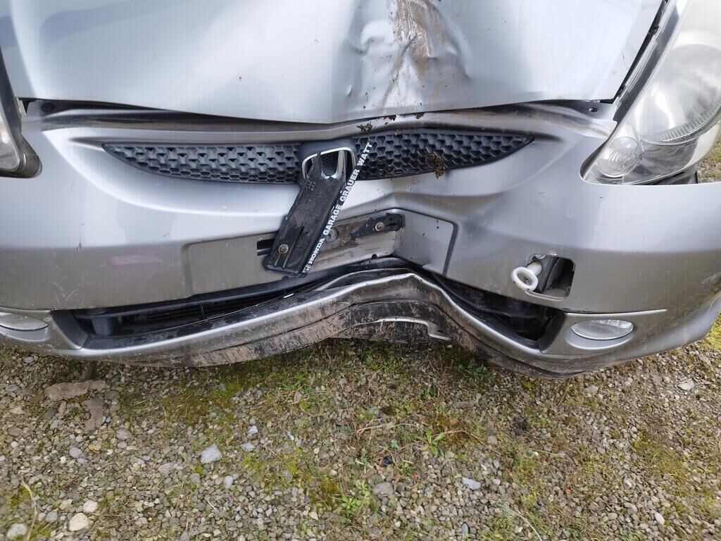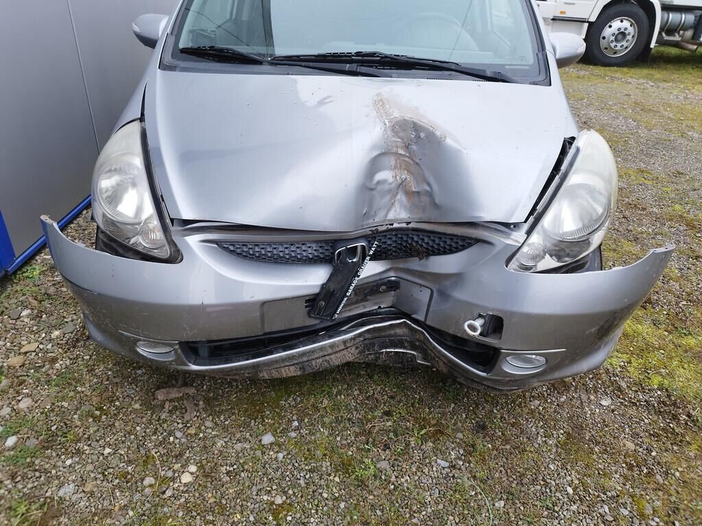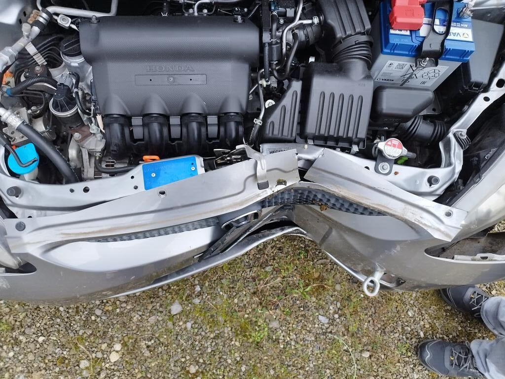 Die ganze Front ist deformiert, alle Kühler sind deformiert, der Kotflügel vorne links ist gestaucht.