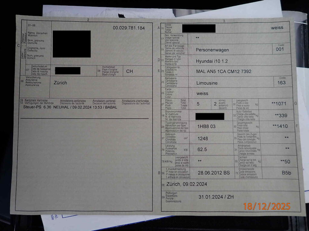 | – MFK Januar `24, CH-Typenschein, 2.Schlüssel & Serviceheft vorhanden, 8-fach bereift. – Tagfahrlicht, Alarmanlage, Bedienung am Lenkrad, elektronische Servolenkung, Zentralveriegelung mit Fernbedienung, Fensterheber V&H elektrisch, Innenspiegel abblendend – Motorhaube lässt sich nicht öffnen! |