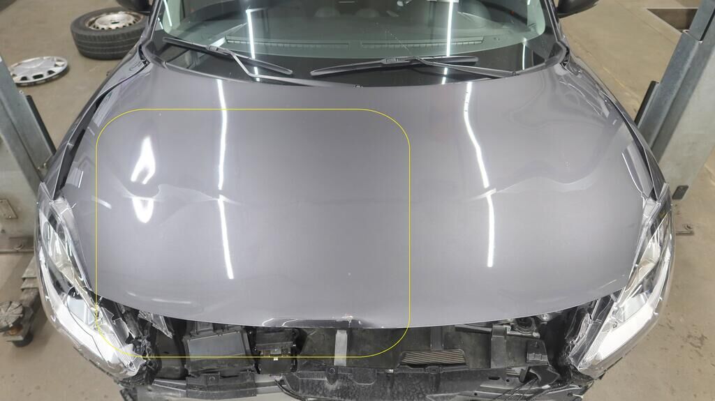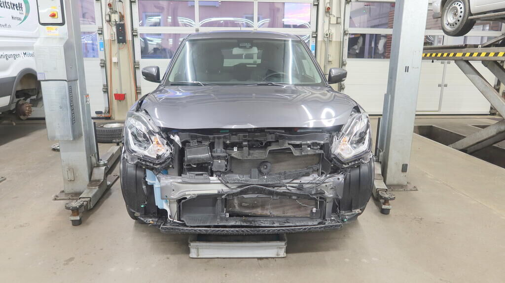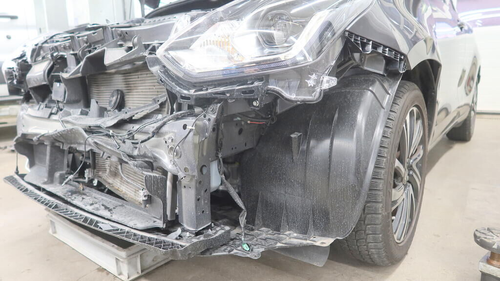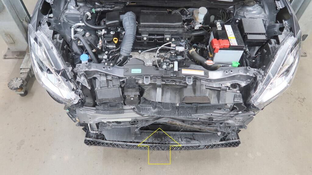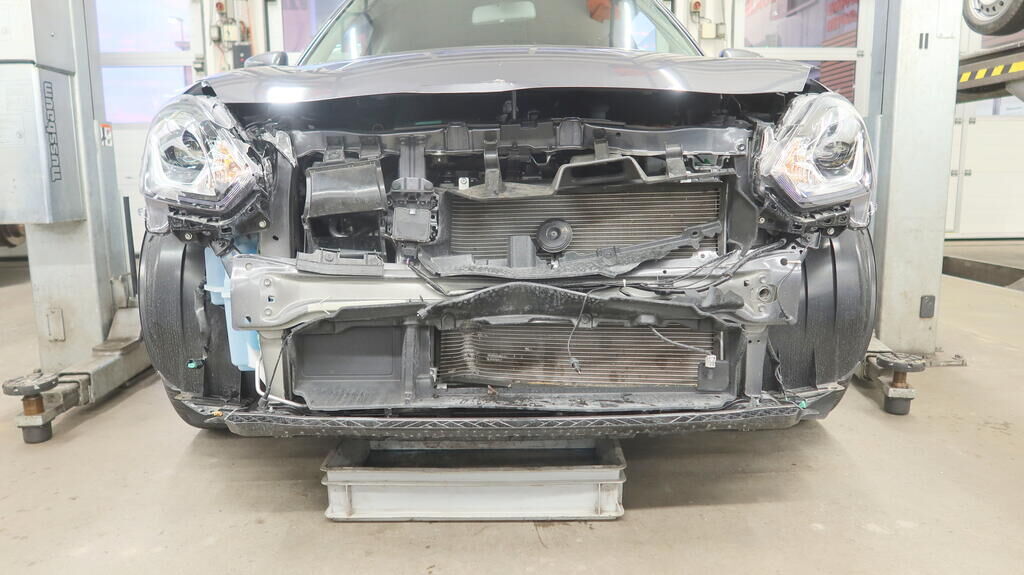 Stossstangenabdeckung vorne gerissen, Kühlergrill gebrochen, Scheinwerfer links und rechts gebrochen, Querträger eingedrückt, Schlossträger deformiert, Kühlerpaket verformt, Kühlerlüfter beschädigt, Diverse Abdeckungen an der Front gerissen und beschädigt, Kabelstrang beschädigt, Radarsensor gebrochen, PDC- Anlage (Zubehör) beschädigt, Motorhaube verformt und gestaucht, Kotflügel rechts und links gestaucht.