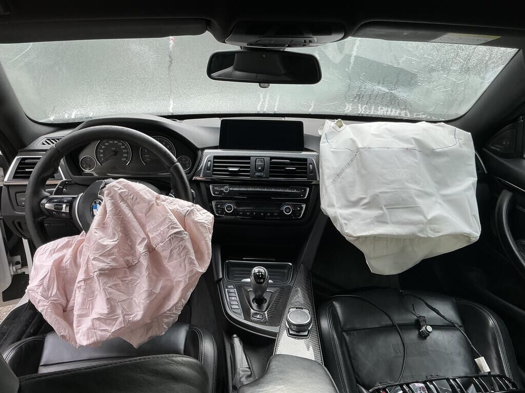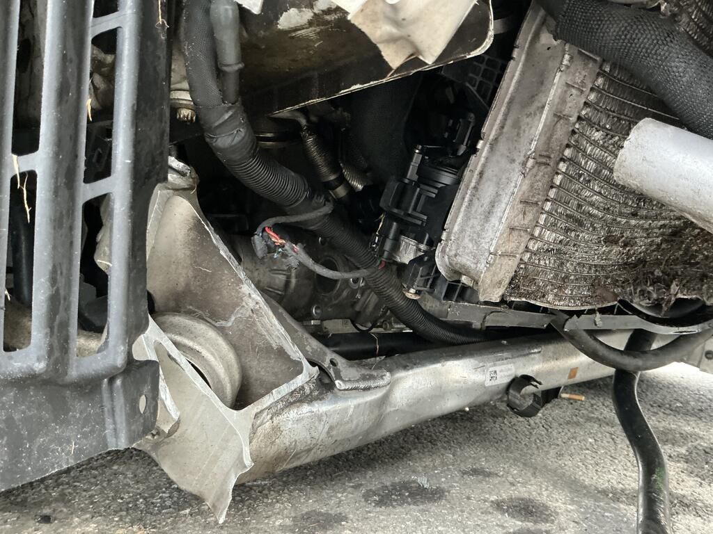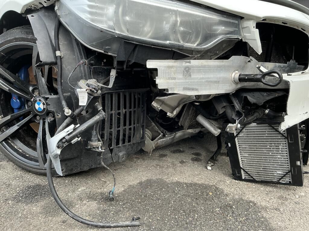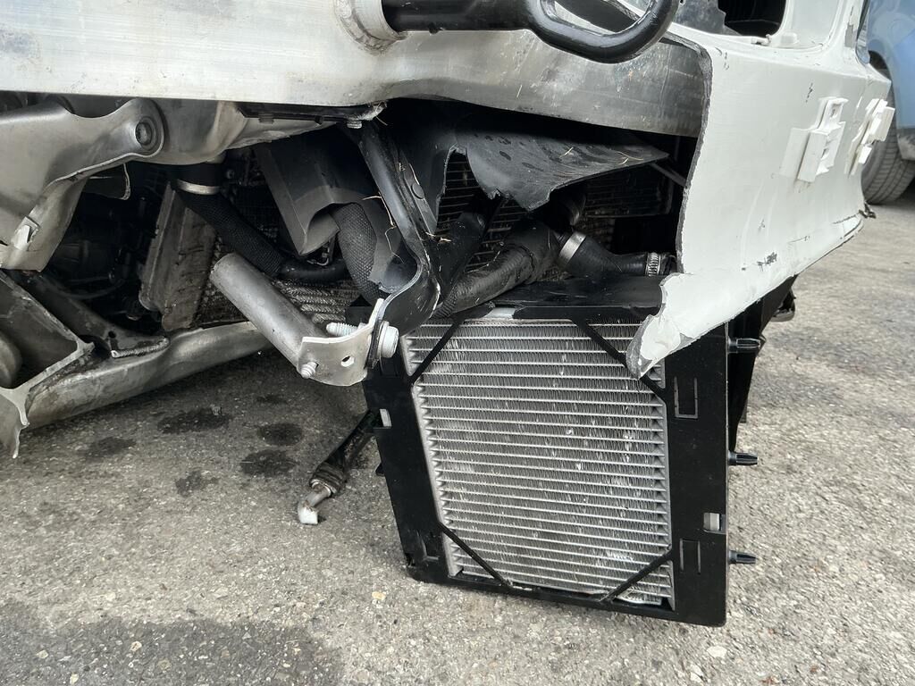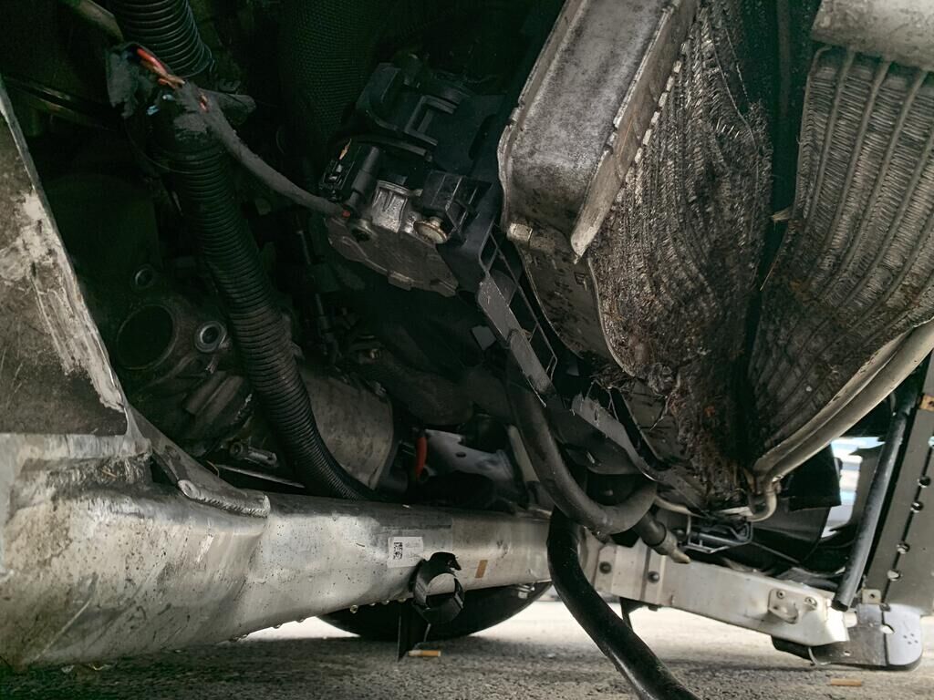 Collision avant droit inférieur: pare-chocs, spoiler, grilles. calandres, phare, capteurs, traverse, ailes, porte-serrure, radiateurs, condenseur, train roulant, suspension, direction, pare-brise, airbags, prétensionneurs de ceinture endommagés.