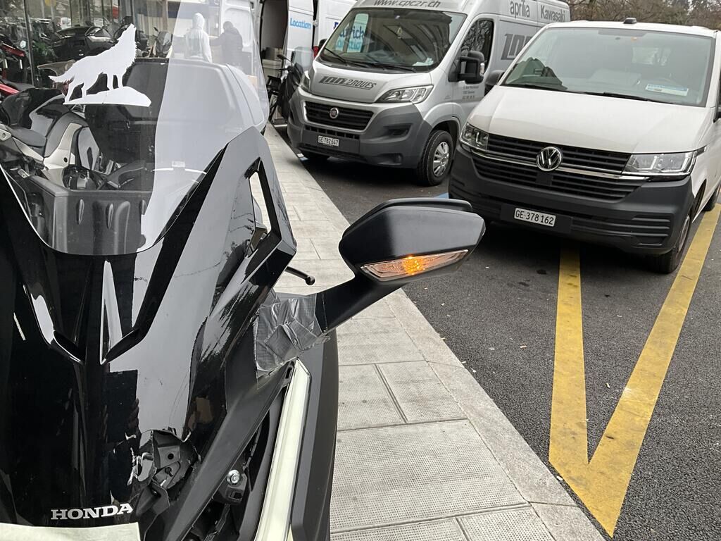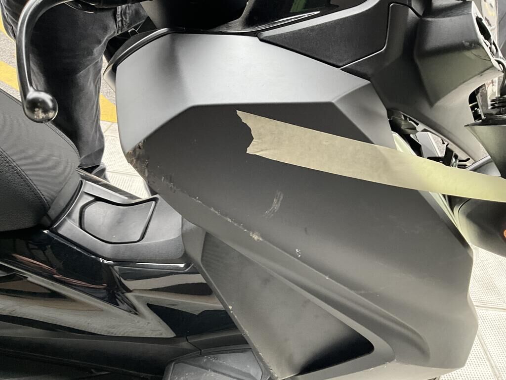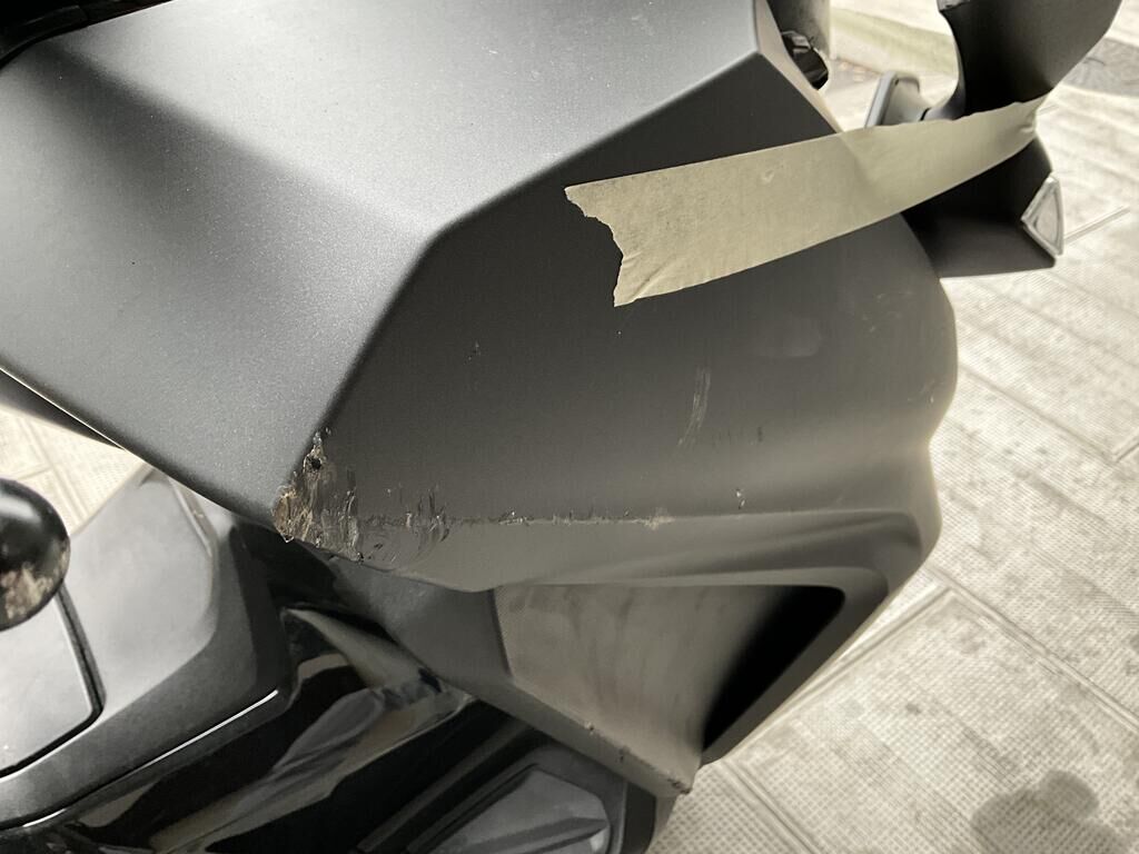 Carénages AV et flanc DR, phare AV, support de carénage, fourche, té de fourche, levier DR, rétroviseur DR, tôle d’échappement.