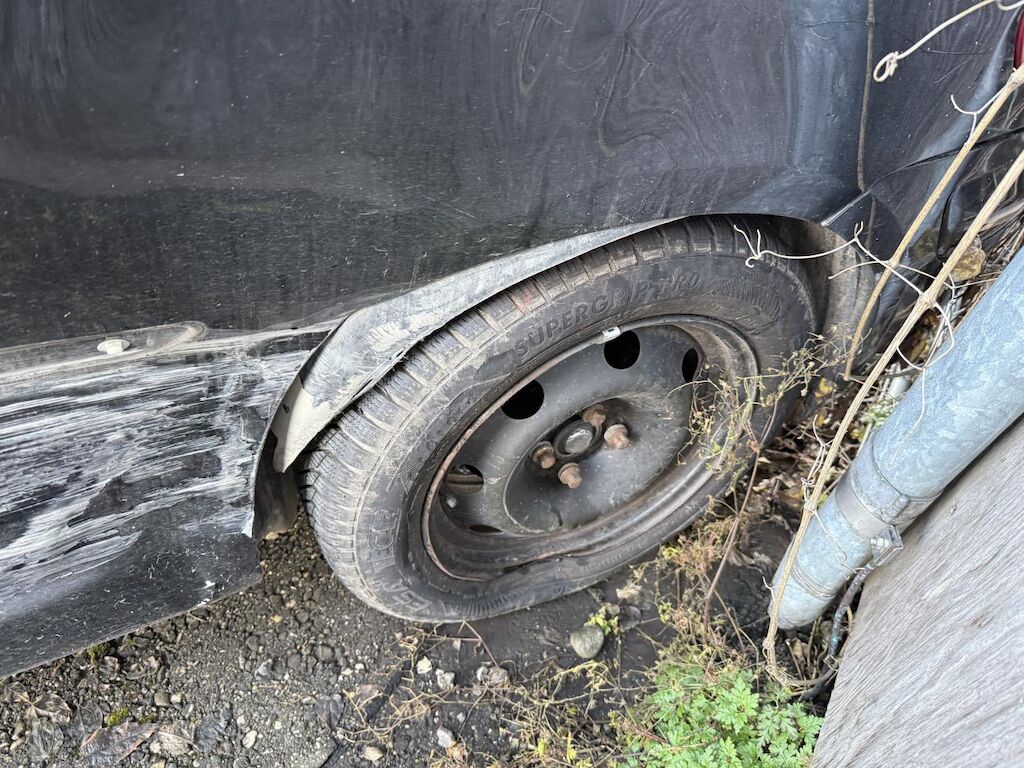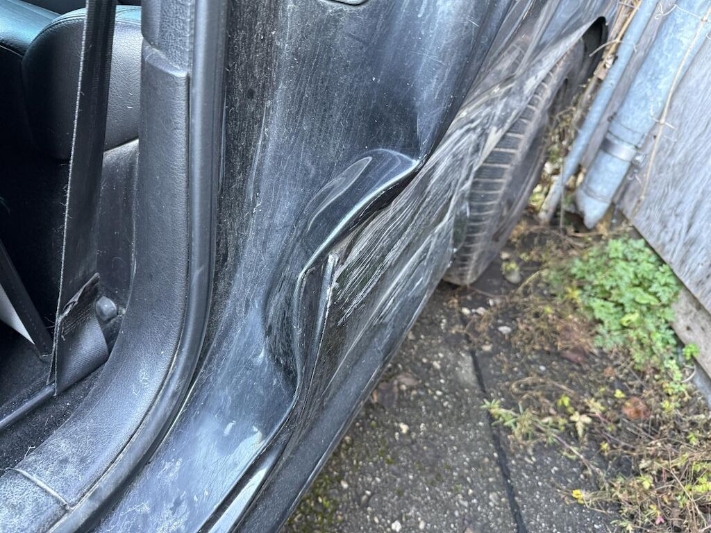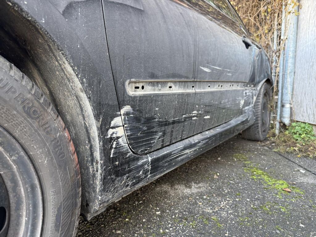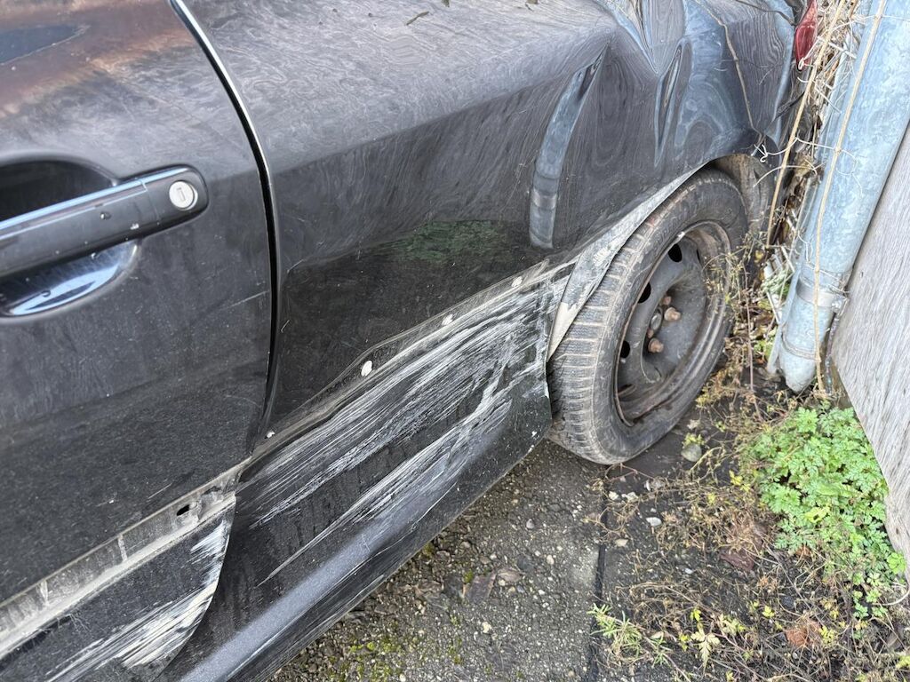 Anprall Seite links, dabei wurden Kotflügel vorne links, Türe links, Seitenwand hinten links sowie die Radaufhängung hinten links beschädigt.