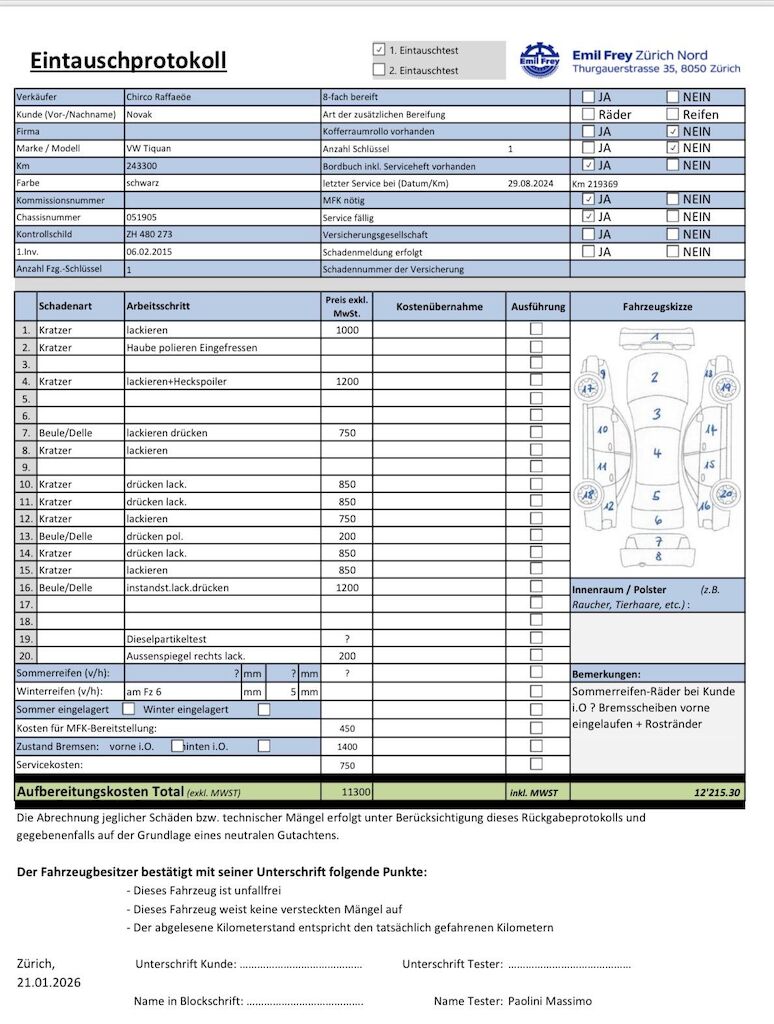| Keine technische Prüfung (Werkstatttest) vorgenommen Diverse Schäden an Karosserie/Lack. Fahrzeug ab Platz, ohne Garantie und Aufbereitung. Keine Gewähr auf die Angaben der Sonder- und Serienausstattung / keine mechanische Prüfung. Fahrzeug wurde unzerlegt expertisiert / keine Haftung für allfällige, nach Demontage bekanntwerdenden Mängel. Fahrzeugbereifung und Ausstattung gemäss Fotos / Fahrzeugkauf auf eigenes Risiko ab Platz ohne Nachwährschaft. Keine technische Prüfung (Werkstatttest) vorgenommen Diverse Schäden an Karosserie/Lack. Fahrzeug ab Platz, ohne Garantie und Aufbereitung. – Div. Kratzer und Dellen am gesamten Fahrzeug. – Aussenspiegel rechts Kratzer – Haube Eingefressen – Bremsscheiben vorne eingelaufen + Rosträmder – Letzter Service am 29.08.2024 bei 219369 Km. |