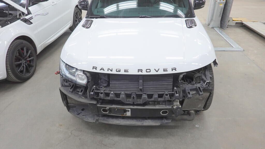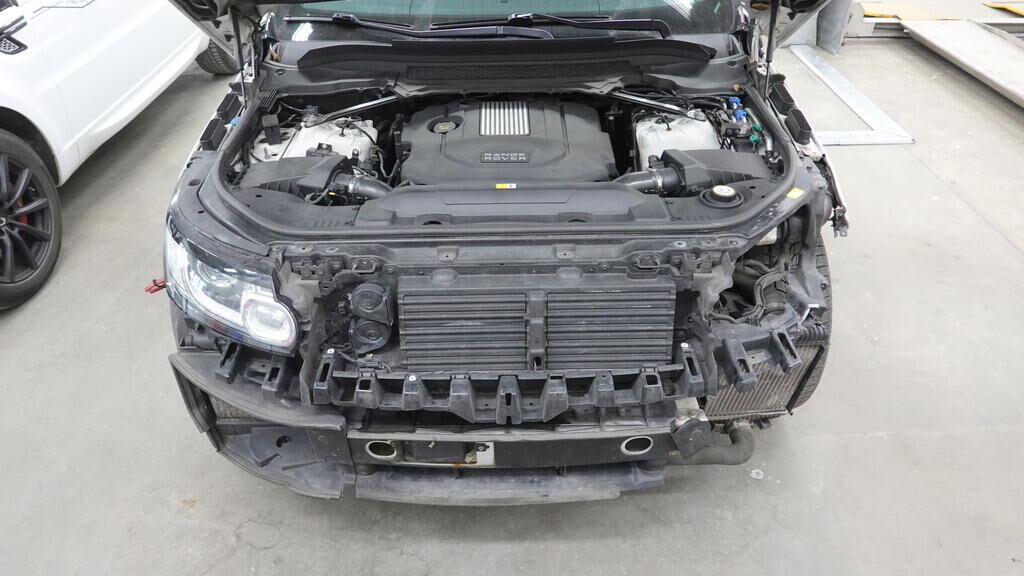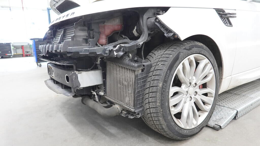 Stossstangenabdeckung und Scheinwerfer vorne links gerissen. Unter der demontierten Stossstangenabdeckung kann festgestellt werden, das auch der Schlossträger verformt und der Ladeluftkühler im Anstossbereich beschädigt wurde.