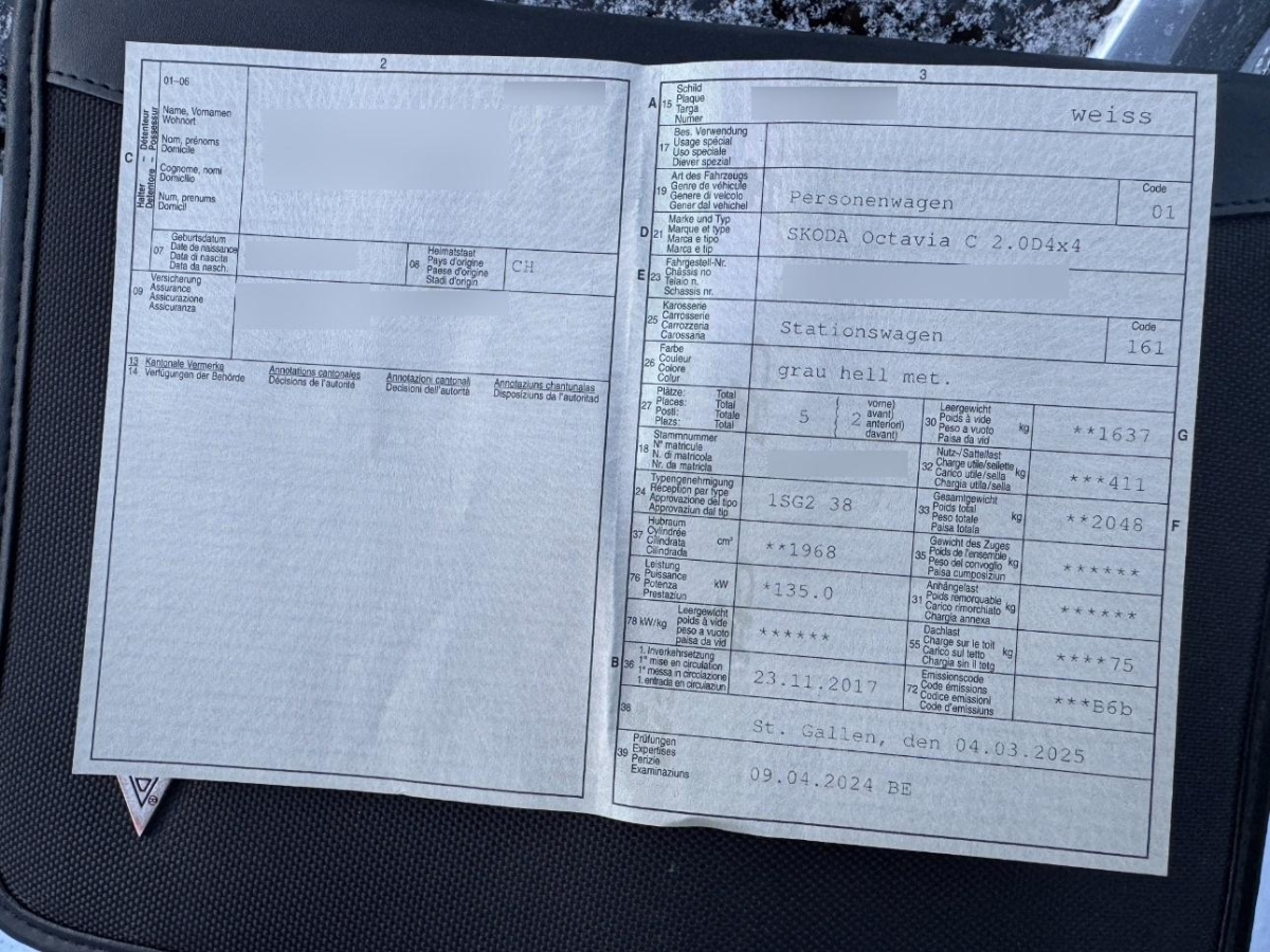 Make up-Spiegel rechts, Airbag: Airbag Fahrer und Beifahrer, ABS, EBD elektronische Bremskraftverteilung, Airbag: Seitenairbag für Fahrer und Beifahrer, Berganfahrhilfe (Hill Holder), Polster: Alcantara-/Leder-Ausstattung, 2 klappbare Schlüssel, Räder: Reifendruckkontrollsystem, Komfortblinker, Sitze: Mittelarmlehne vorne inkl. grosser Jumbo-Box (kühlbares Ablagefach), Sitze: 3 Kopfstützen hinten, Cargo Organizer, Lichtwarnsummer, USB-Anschluss, Wärmeschutzverglasung, Media: SmartLink, Heckscheibenheizung, Media: DAB+ (Digital Audio Broadcasting), Sitze: Rücksitzlehne mit Fernbedienung aus Kofferraum, Sitze: Rücksitzlehne geteilt abklappbar, Ablagen in den Türen, Scheibenwischer vorne mit Intervall, Kennzeichenbeleuchtung in LED, Dekoreinlagen, Teppichfussmatten vorne und hinten, Ambiente Beleuchtung LED, Elektrische Fensterheber vorne + hinten, Sitze: Vordersitze heizbar, Soundsystem, Multikollisionsbremse, Partikelfilter und Oxydationskatalysator, Media: Komplette Telefonvorbereitung mit Bluetooth, Wegfahrsperre elektronisch, Sequentielles 6-Gang-Getriebe mit Automatikfunktion, Brillenfach, Cupholder vorne, Elektronische Differentialsperre (XDS+), Leichtmetallräder Turbine 18J, anthrazit, Sonnenblende zweifach, Regenschirm, Infotainment Online 3 Jahre, Blinker in Aussenspiegel, Assist: Tempomat, Chrom-Paket, LED Heckleuchten Plus, Parksensoren vorne und hinten, Elektronisches Stabilitäts-Programm (ESP), Aussenspiegel in Wagenfarbe, Klima: Klimatisierungsautomatik Climatronic, Airbag: Window-Kopfairbags, Dachreling schwarz, Fussraumbeleuchtung vorne und hinten, Räder: Pannenset, Airbag: Airbag Beifahrer deaktivierbar, Höhenverstellbare Gurten vorne, Airbag: Knie-Airbag für Fahrer, Sitze: Fahrersitz elektrisch verstellbar mit Memory, Sitze: Kreuzstützen für Vordersitze verstellbar, Aussenspiegel und Türgriffe in Wagenfarbe, Scheinwerfer-Waschanlage, Innenspiegel automatisch abblendbar, Licht: Nebelscheinwerfer mit Cornering-Funktion, Voll-LED-Scheinwerfer, Zentralverriegelung mit Fernbedienung, Allradantrieb permanent, Sitze: Vordersitze höhenverstellbar, Nebelschlussleuchte, Drittes Bremslicht, Pollenfilter (Staubfilter), Bremsenergie-Rückgewinnung, Maxi-DOT Display farbig, Befestigungsösen im Laderaum, ISOFIX Kindersitzvorrichtung, Nichtraucherausführung, Mittelarmlehne hinten, Verzurrösen, Antriebsschlupfregelung (ASR), Aussenspiegel rechts und links beheizt, elektrisch verstell-/ und einklappbar mit Memory, automatisch abblendend, LED Taschenlampe im Kofferraum,abnehmbar, 3-Punkt-Sicherheitsgurte auf allen Plätzen, Servolenkung, Gurtstraffer vorne und hinten, 3 Speichen Multifunktionslenkrad für Radio und Telefon, Navigationssystem AMUNDSEN