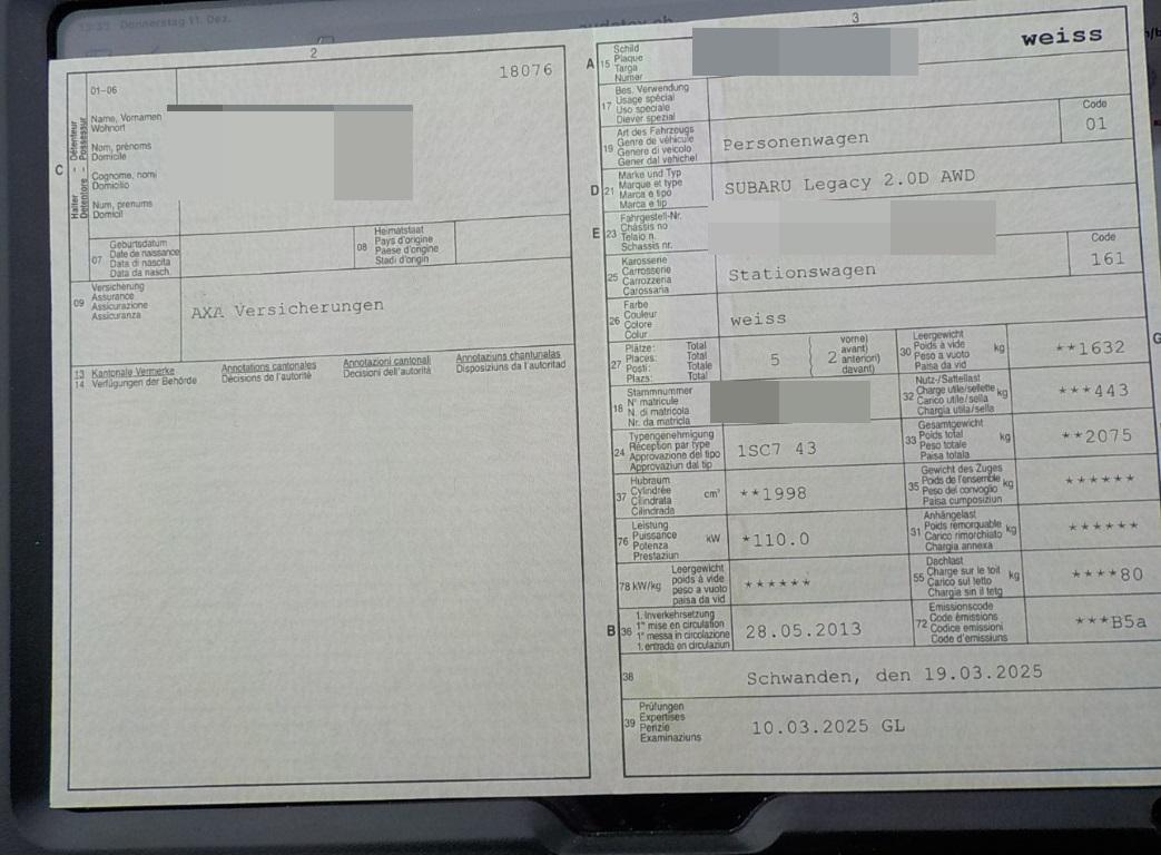 | Fahrzeugausweis | Vorhanden |
