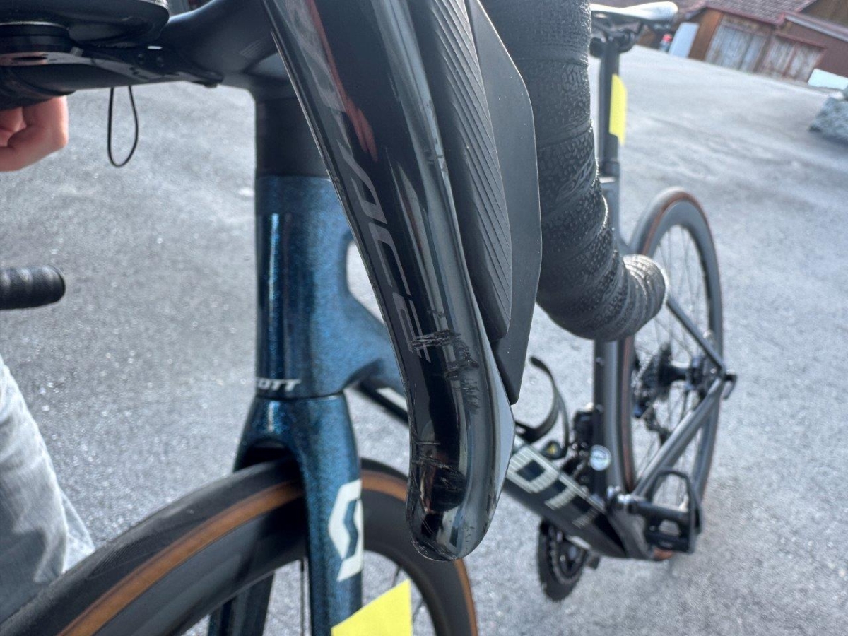 Schadensbeschreibung Anprall Front und rechte Seite: Dabei wurden das Vorderrad, der Lenker, die Gabel, der Rahmen, das Schaltwerk, die Pedale, der Velo-Computer sowie diverse weitere Anbauteile in der Anprallzone beschädigt. Hinweise: Der Rahmen weisst nur oberflächliche leichte Beschädigungen auf, macht jedoch beim Fahren Knackgeräusche im Lenkkopfbereich! Zustand gemäss den Bildern.