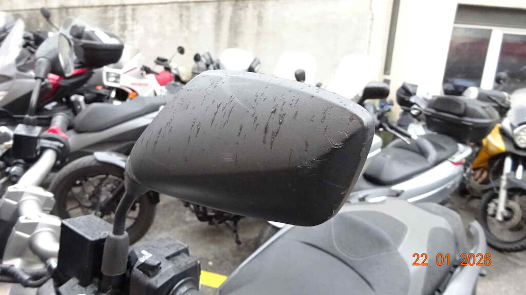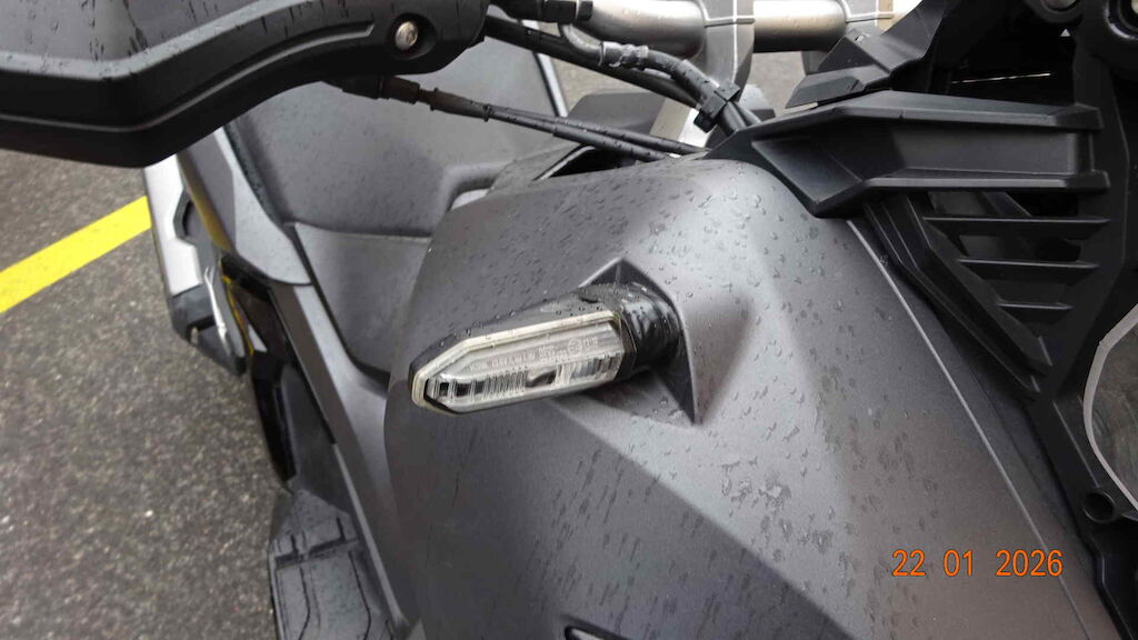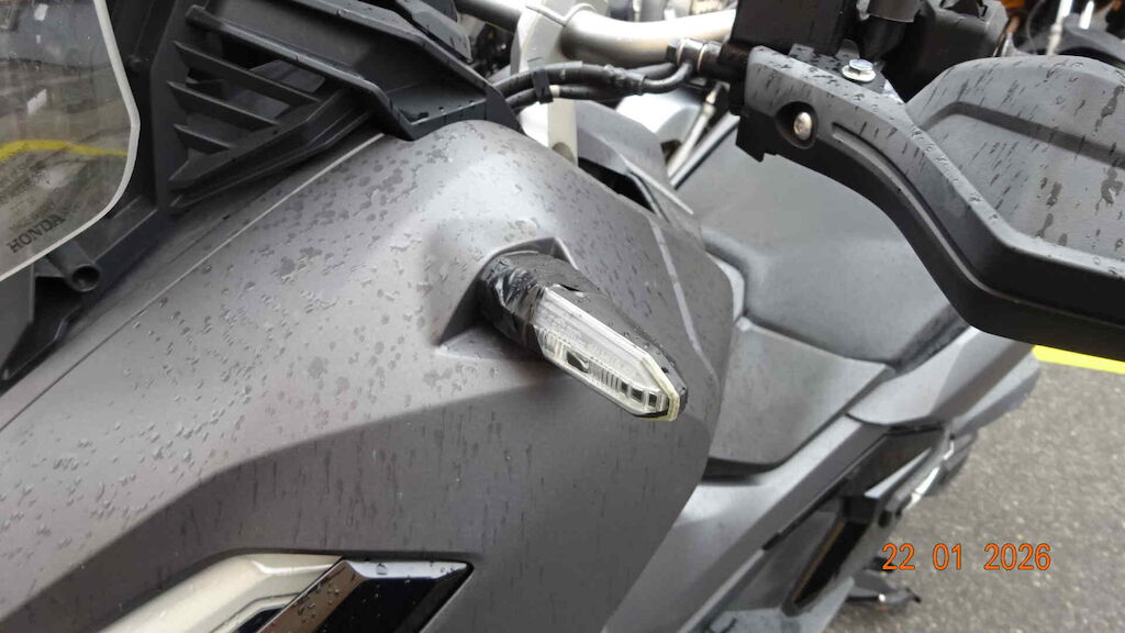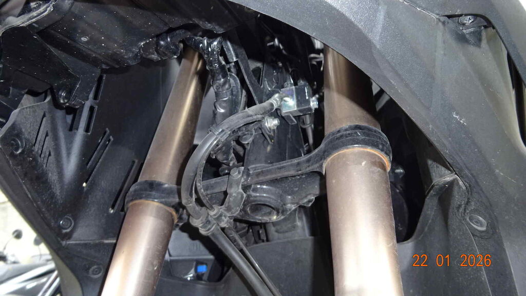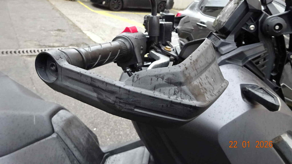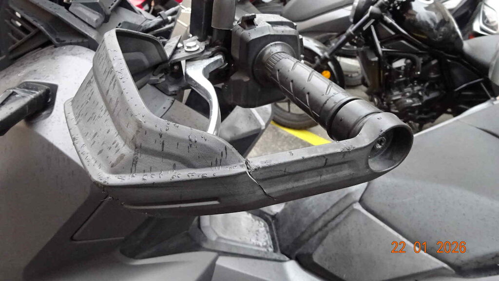 Roue, fourche, T de fourche, clignoteur avant, guidon, protège-main, retro, carenage arrière côté gauche, etc.